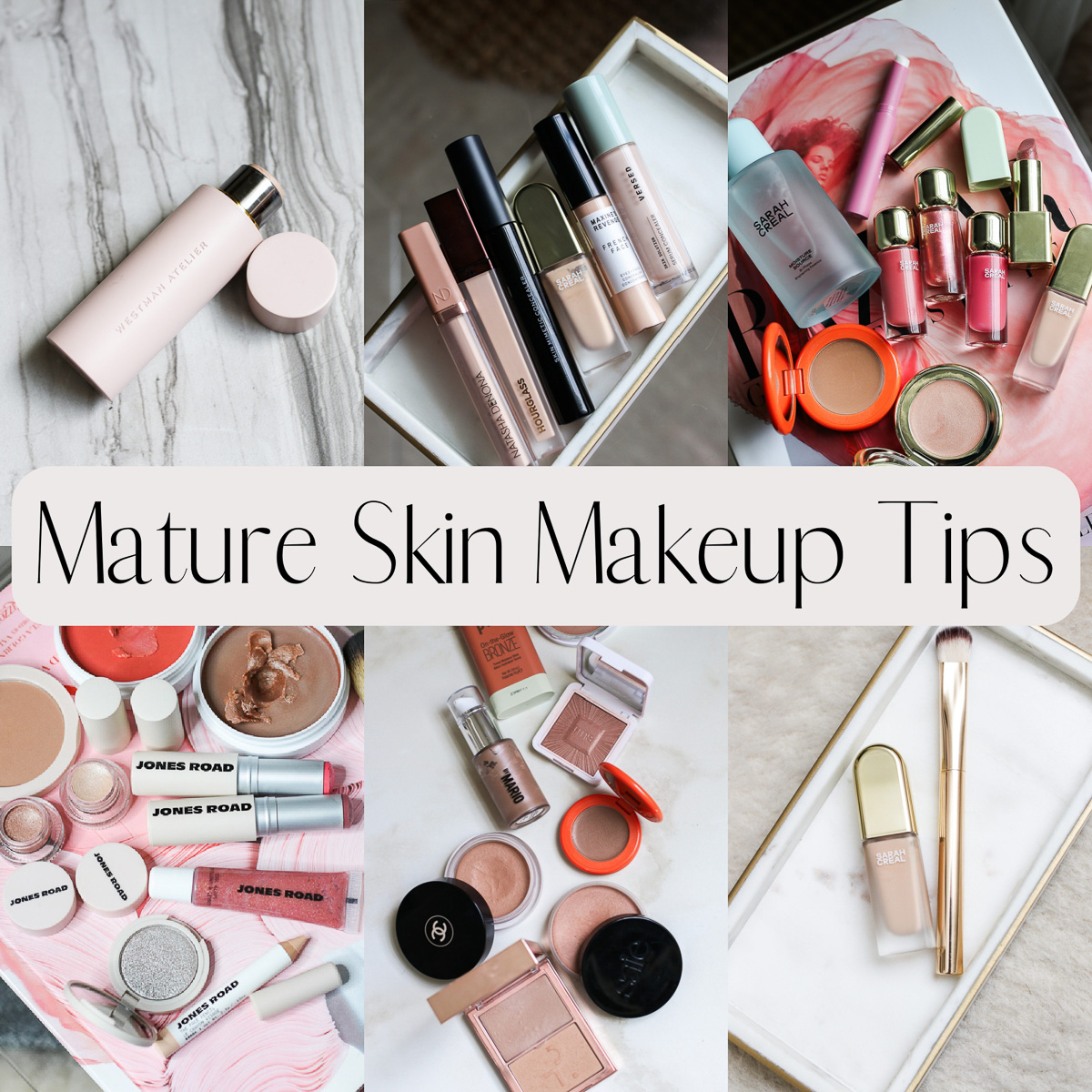 Here are 5 of my favorite complexion products for mature skin: Trinny London BFF De-Stress Serum, Colorscience Face Shield Flex SPF 50, L’oreal True Match Hyaluronic Tinted Serum, Westman Atelier Vital Skin Foundation and Missha Perfect Cover BB Cream SPF 42