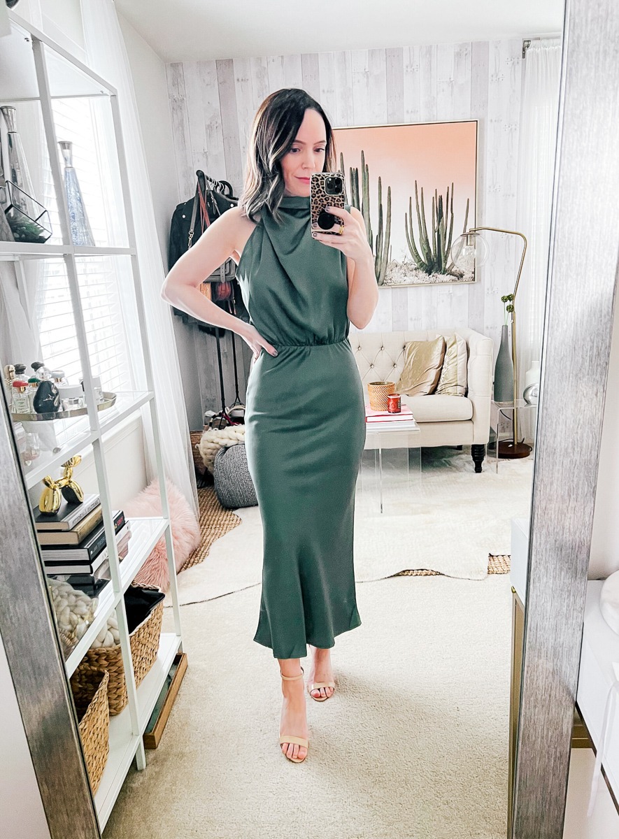 This is one of my most recommended wedding guest dresses. One of my friends purchased it for a spring wedding last year and told me it was one of the best dresses she has ever worn. It comes in a ton of colors but this sage dress would be perfect for a springtime wedding.