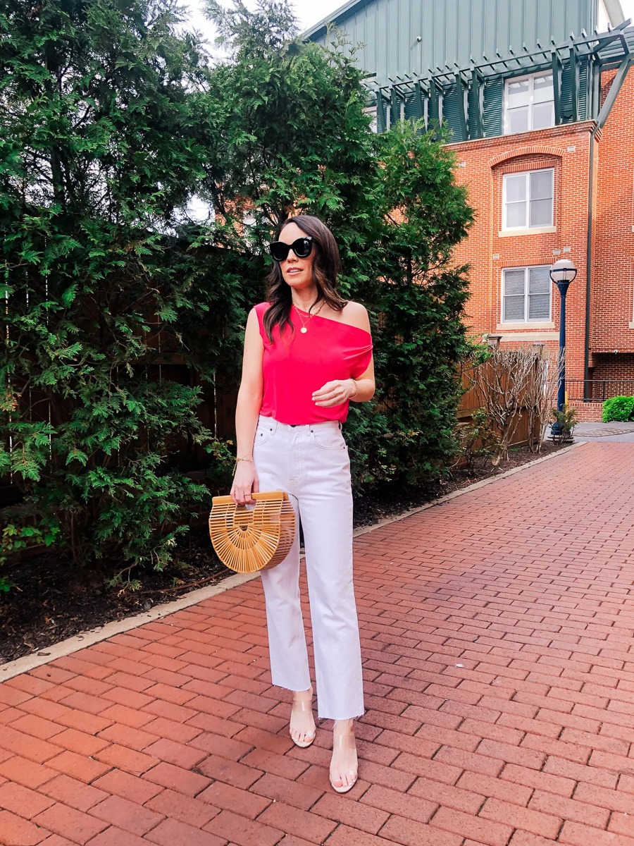 After the cold and dark of winter, it is fun to add a bit of color into your wardrobe for spring. A bright top like this is an instant mood elevator too! This particular style comes in a ton of colors but I love this bright pink paired with simple white jeans and clear heels.
