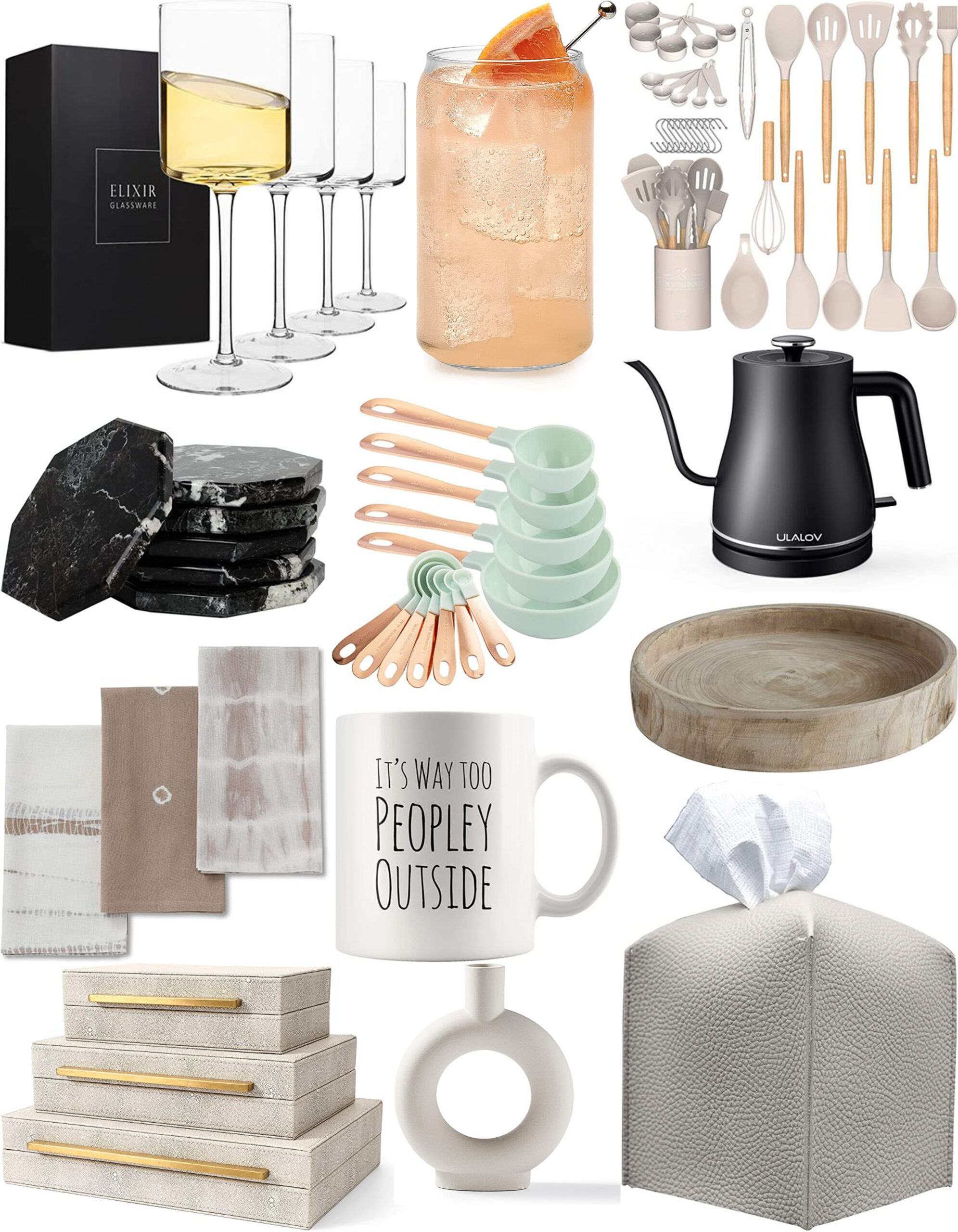 Wine Glasses | Tumblers | Kitchen Tools | Marble Coasters | Measuring Spoons and Cups | Tea Kettle | Dish Towels | Mug | Wooden Tray | Decorative Boxes | Vase | Tissue Box Cover