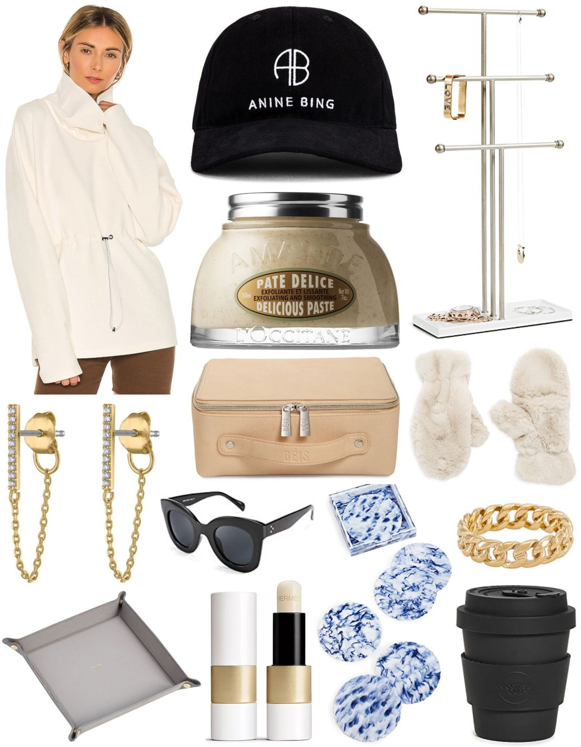Sweatshirt | Baseball Cap | Jewelry Stand | Body Scrub | Earrings | Sunglasses | Travel Case | Mittens | Catch All Tray | Lip Balm | Coasters | Ring | Reusable Coffee Cup