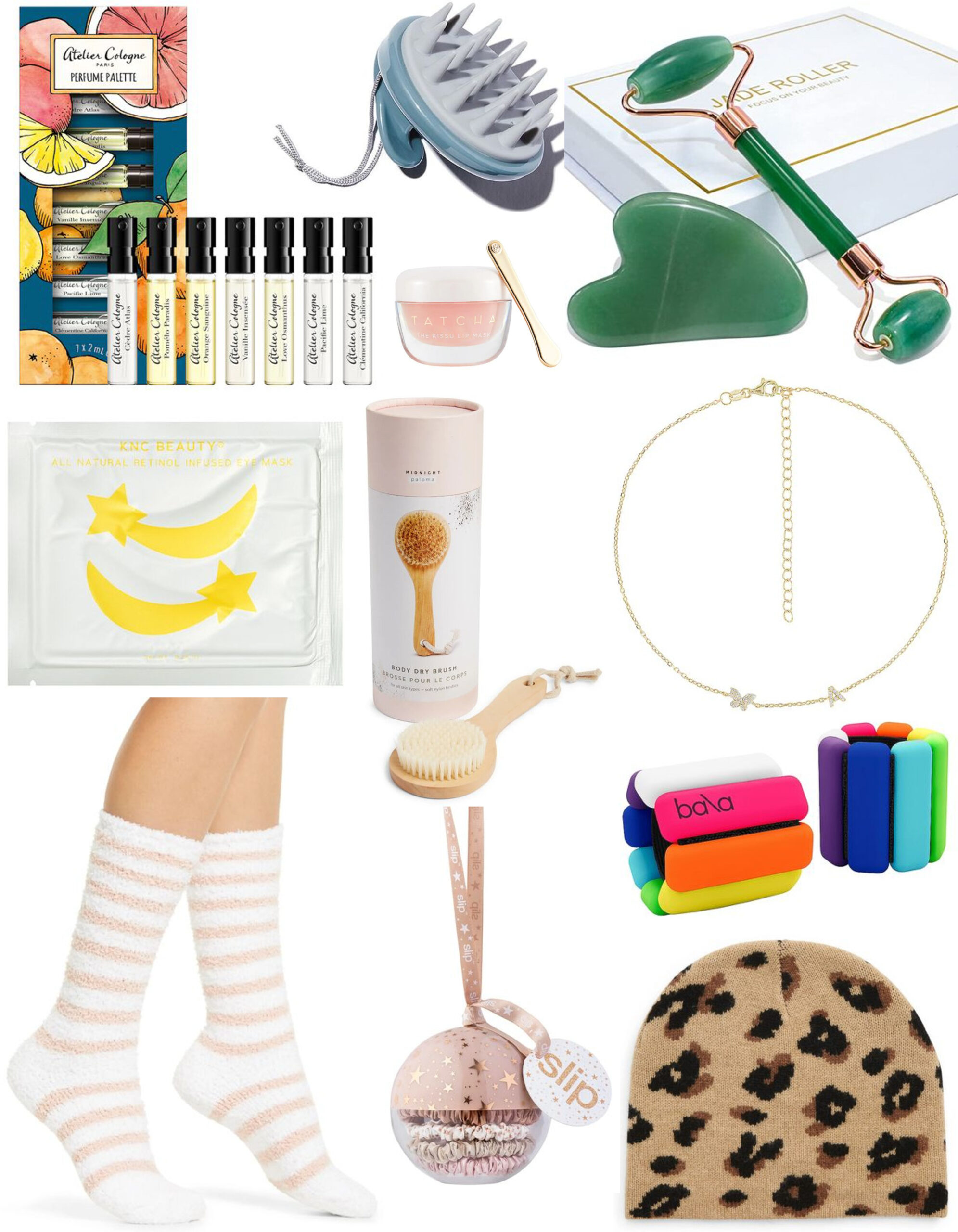 Fragrance Set | Scalp Massager | Jade Roller and Gua Sha | Lip Mask | Eye Masks | Body Dry Brush | Initial Necklace | Socks | Silk Scrunchies | Ankle Weights | Beanie