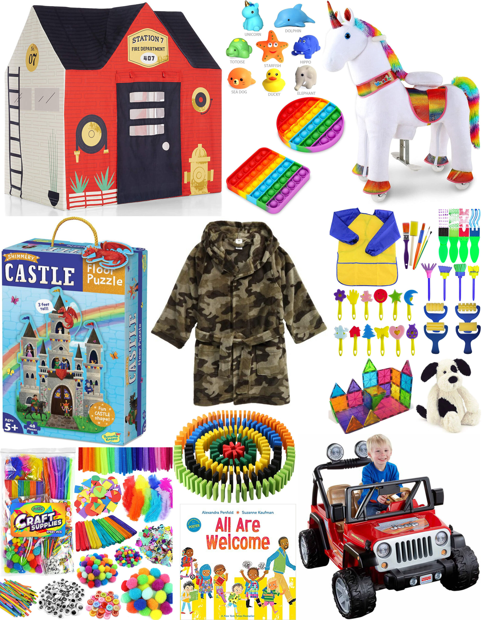 Fire Station Playhouse | Light Up Bath Toys | Pop It Toys | Ride On Unicorn | Castle Floor Puzzle | Robe | Paint Brush Set | Magnatiles | Stuffed Puppy | Craft Set | Dominos | All Are Welcome Book | Mini Jeep