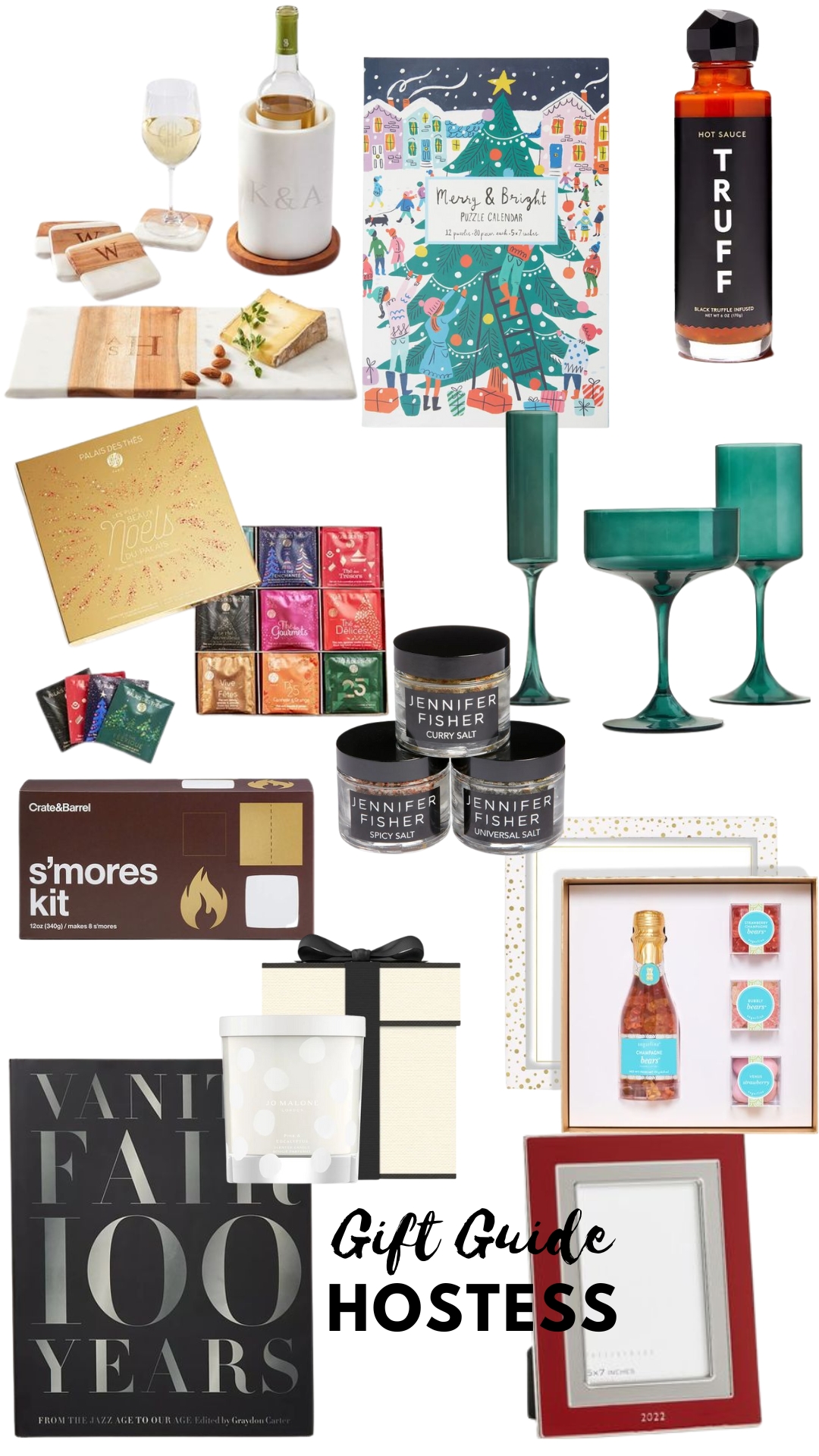 Wood and Marble Gift Set | Puzzle Calendar | Black Truffle Infused Hot Sauce | Holiday Tea Assortment | Wine Glasses | Jennifer Fisher Salt Trio | S’mores Kit | Sugarfina Gift Box | Coffee Table Book | Jo Malone Candle | Picture Frame
