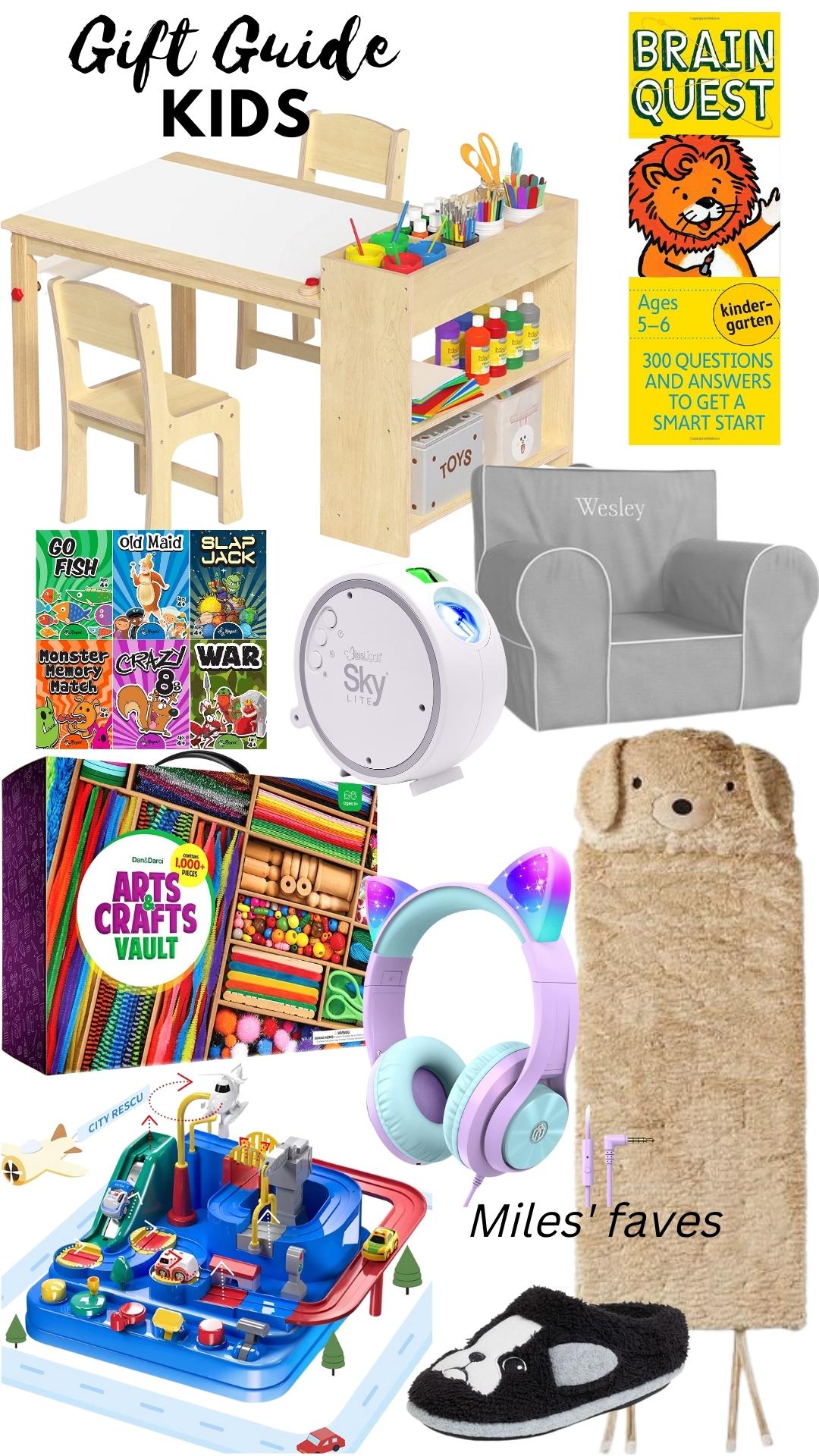 Art Table | Trivia Cards | Pack of Card Games | Star Projector | Pottery Barn Kids Anywhere Chair | Arts and Crafts Box | Race Track | Headphones | Pottery Barn Kids Sleeping Bag | Slippers