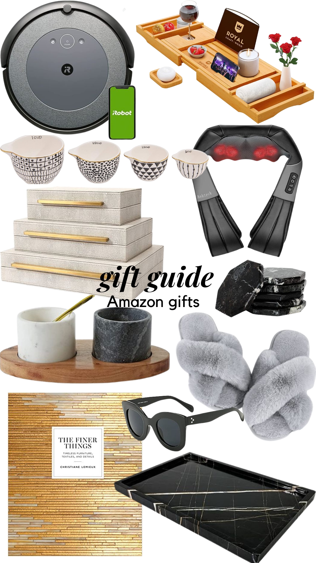 Roomba | Bath Tray | Measuring Cups | Neck Massager | Decorative Boxes | Coasters | Salt and Pepper Bowls | Coffee Table Book | Slippers | Sunglasses | Marble Tray