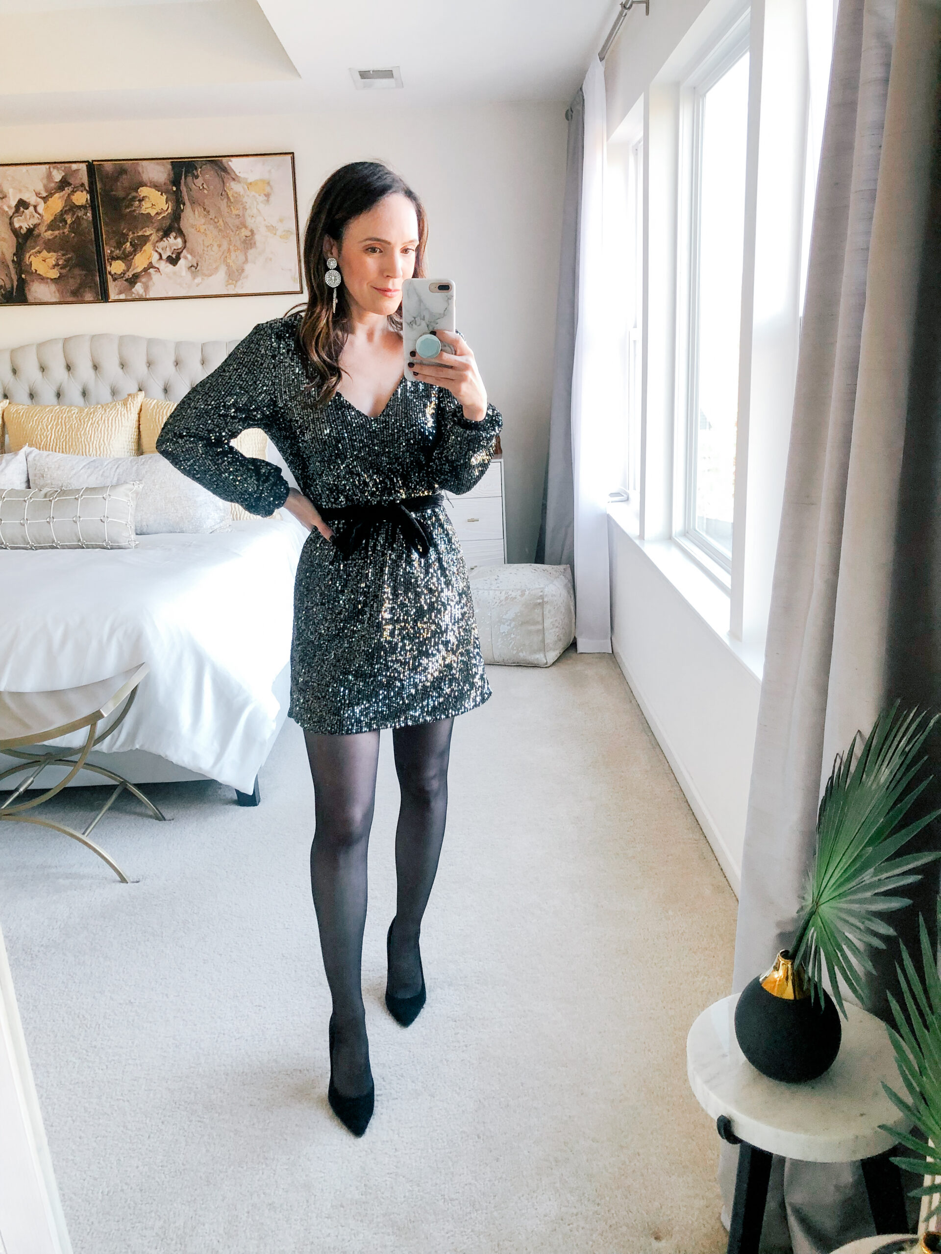 Dress – BB Dakota (also available here) | Tights – Wolford | Shoes – Something Navy (similar) | Earrings – 8 Other Reasons (similar)