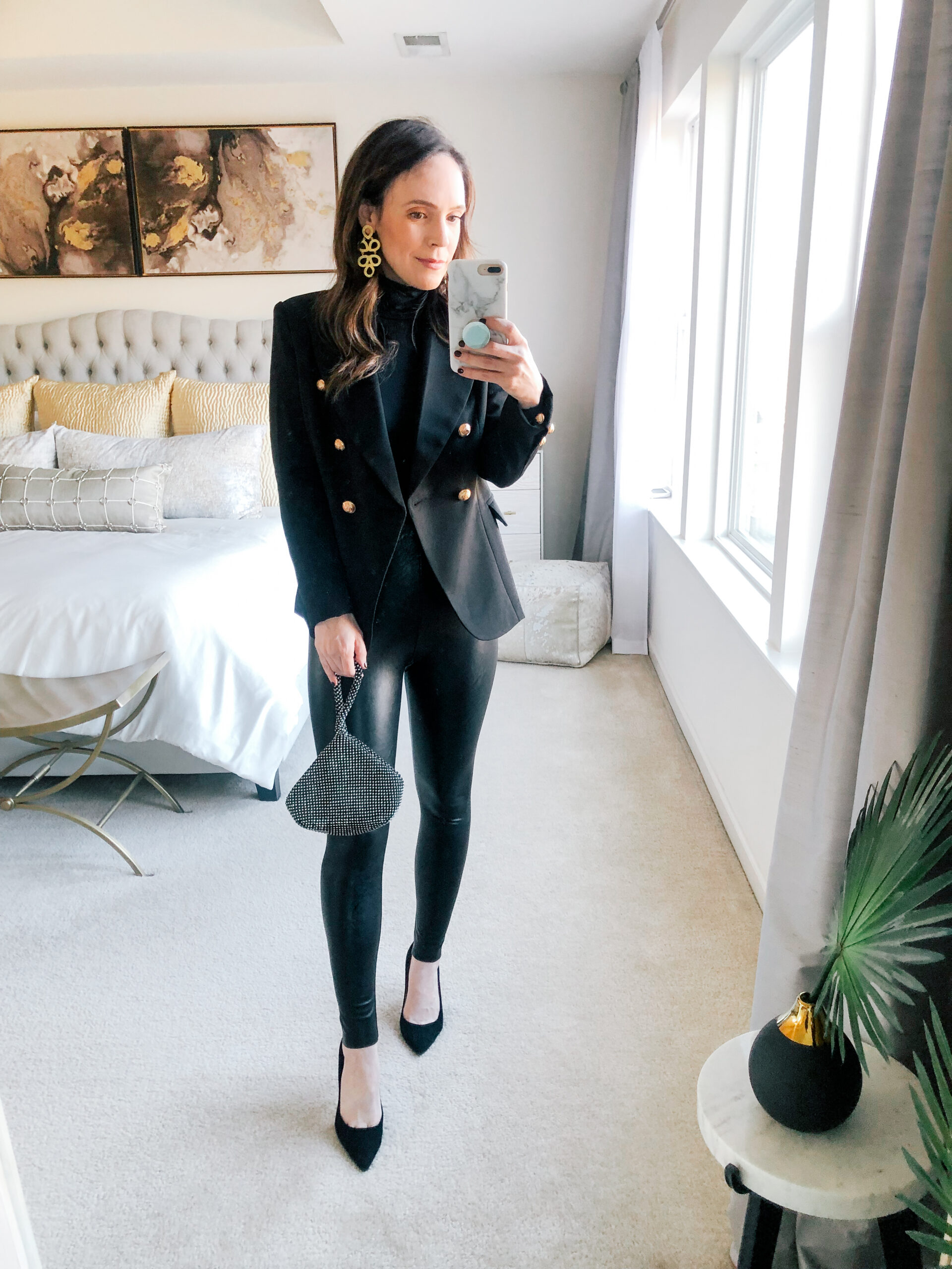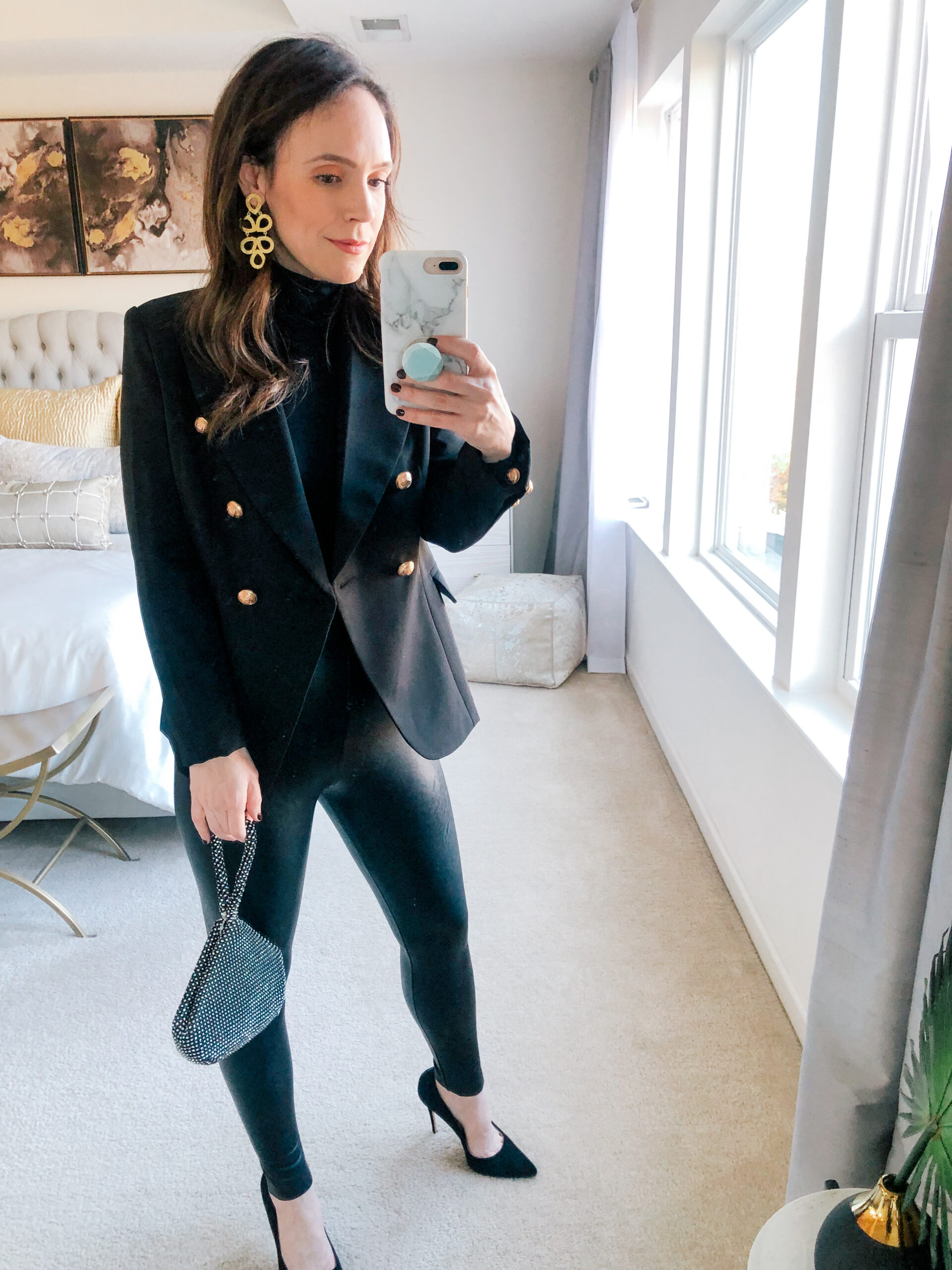 Blazer – Lioness | Bodysuit – Spanx | Leggings – Commando | Shoes – Something Navy (similar) | Bag – Amazon | Earrings – Lisi Lerch