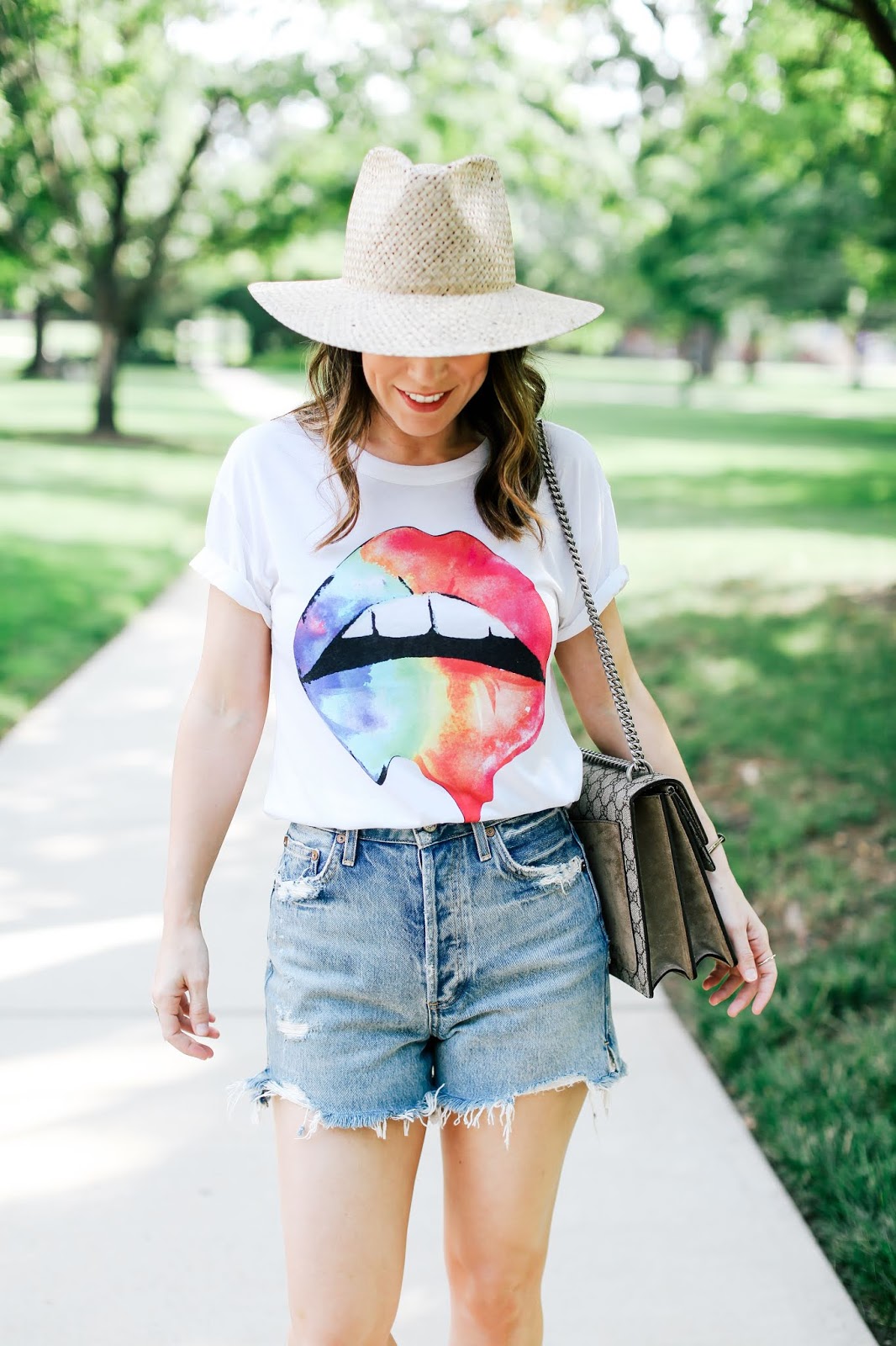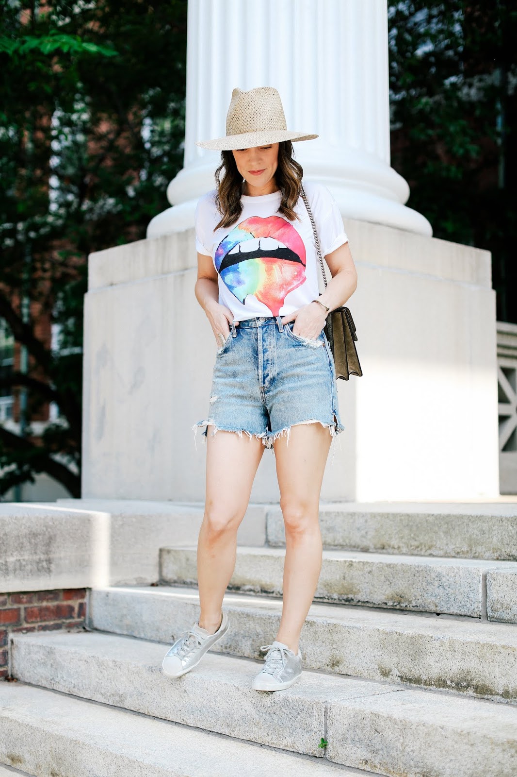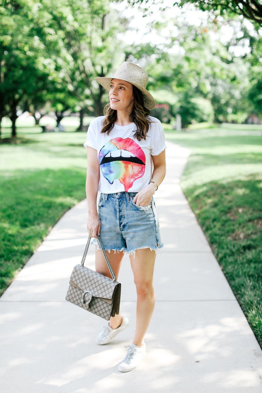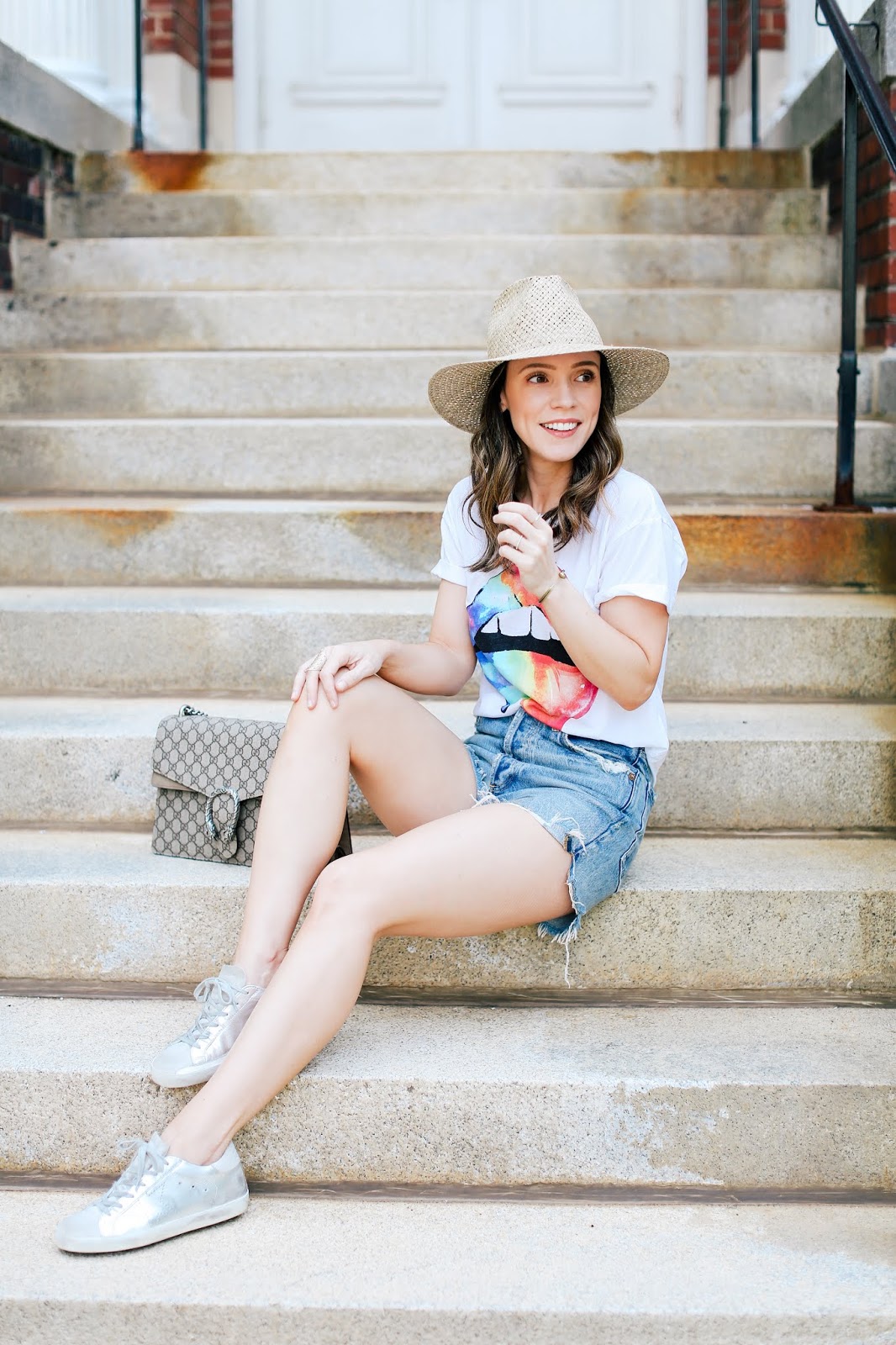 Tee – Chaser (similar tee here, here and here) | Shorts – Agolde (I tried these on and they are a great less expensive option) | Sneakers – Golden Goose (similar here and $30 similar version here) | Bag – Gucci | Hat – Janessa Leone (similar here and here) | Bracelet – Giles & Brother