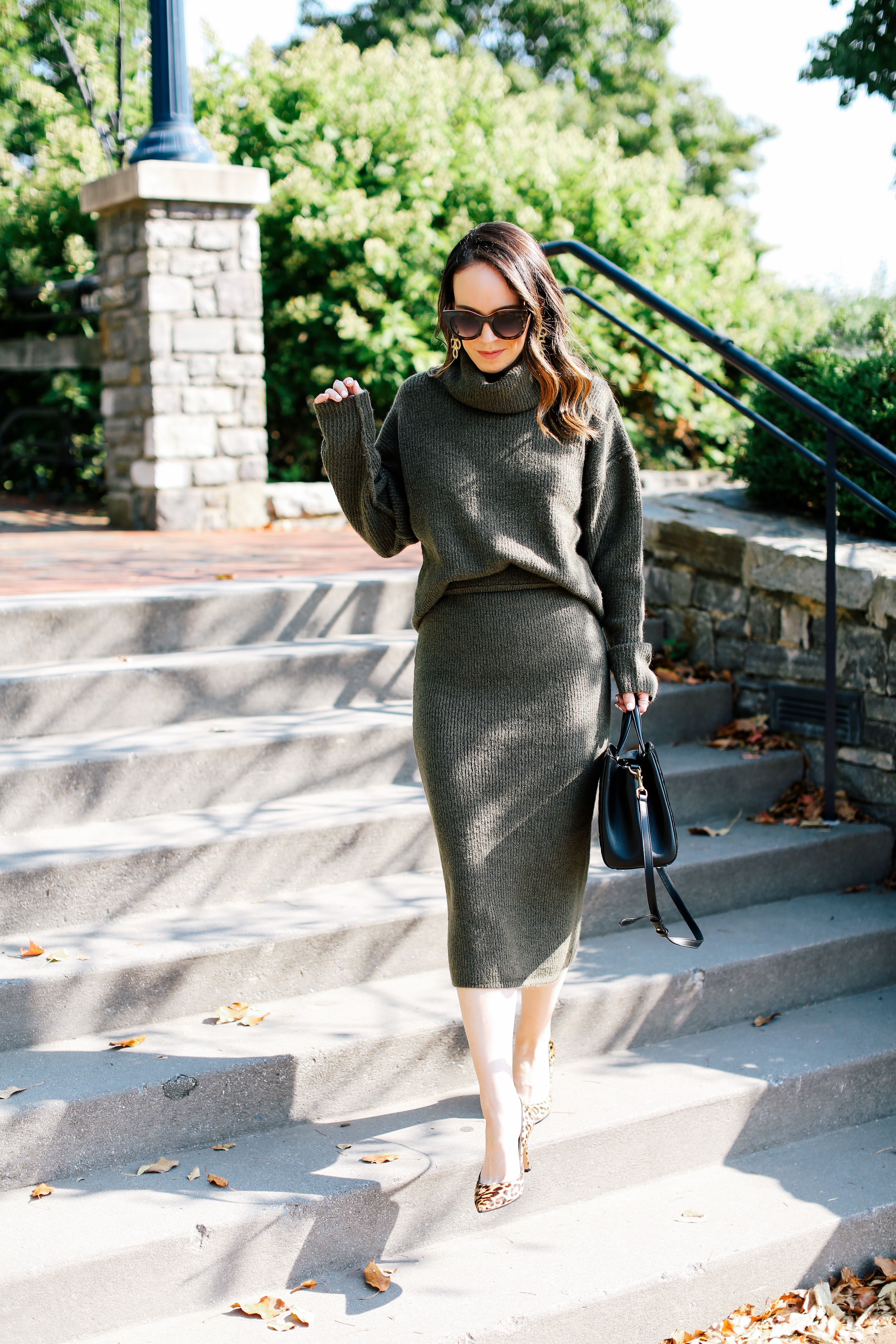 I have seen matching sweater sets popping up like crazy in so many retailer’s fall collections and I absolutely love the look. A matching set is always easy to style because all you have to worry about is shoes and a bag. No standing in front of your closet wondering what goes with the skirt you want to wear that day. However, if you decide to wear the pieces separately as well, it allows for more outfit ideas! I found this sweater set on Asos and thought the oversized chunky knit with the slim skirt was so chic. I should also mention that it felt like I was wearing loungewear when I had this on – the fit is stretchy and the material is quite soft. So while it looks put together, it feels like you walked out of your house in cozy separates. A few other matching sweater sets I found on Asos – this gorgeous mint green set, the same set as mine but in white and I love this short sleeved beige version!