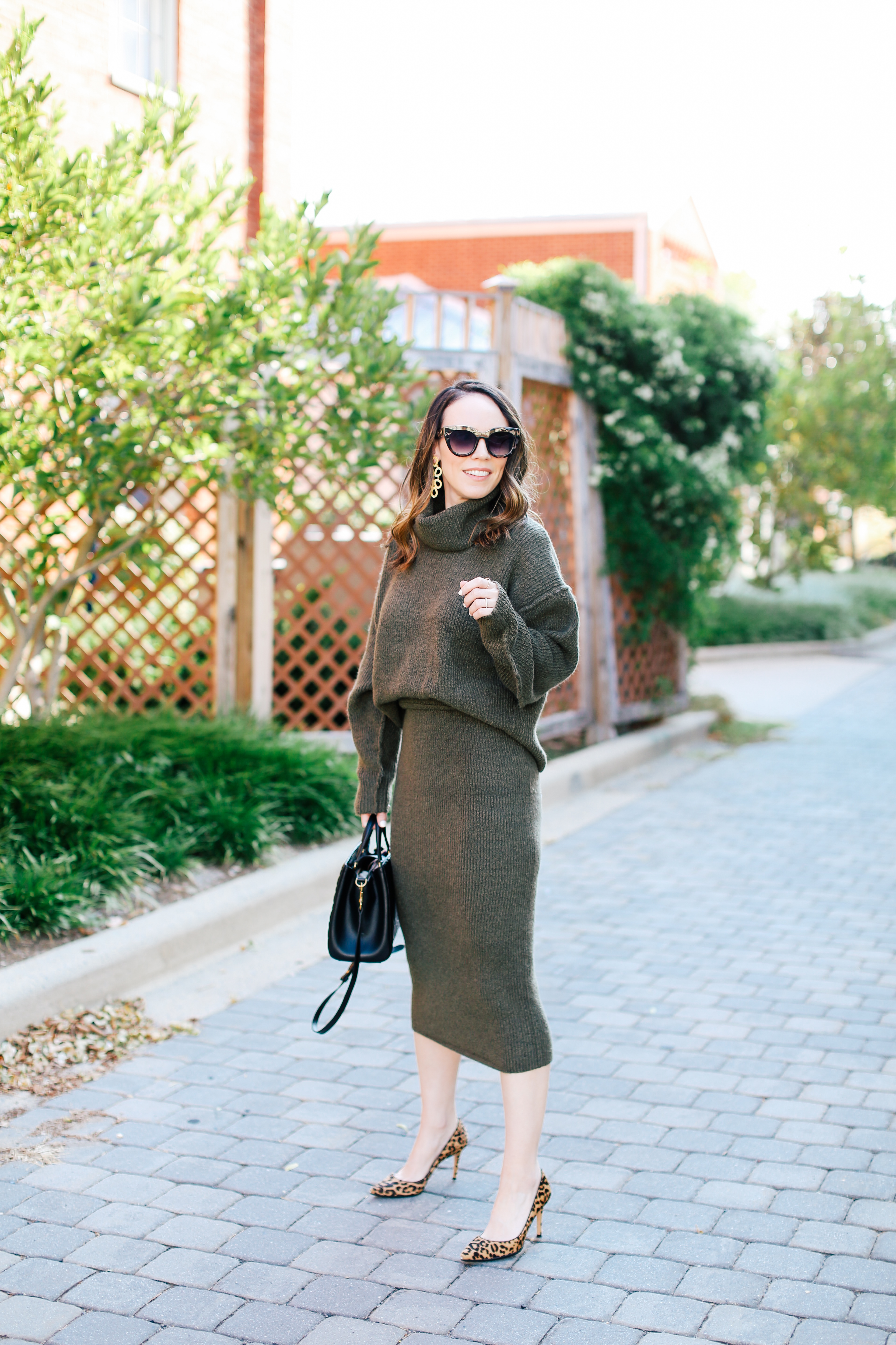 I have seen matching sweater sets popping up like crazy in so many retailer’s fall collections and I absolutely love the look. A matching set is always easy to style because all you have to worry about is shoes and a bag. No standing in front of your closet wondering what goes with the skirt you want to wear that day. However, if you decide to wear the pieces separately as well, it allows for more outfit ideas! I found this sweater set on Asos and thought the oversized chunky knit with the slim skirt was so chic. I should also mention that it felt like I was wearing loungewear when I had this on – the fit is stretchy and the material is quite soft. So while it looks put together, it feels like you walked out of your house in cozy separates. A few other matching sweater sets I found on Asos – this gorgeous mint green set, the same set as mine but in white and I love this short sleeved beige version!