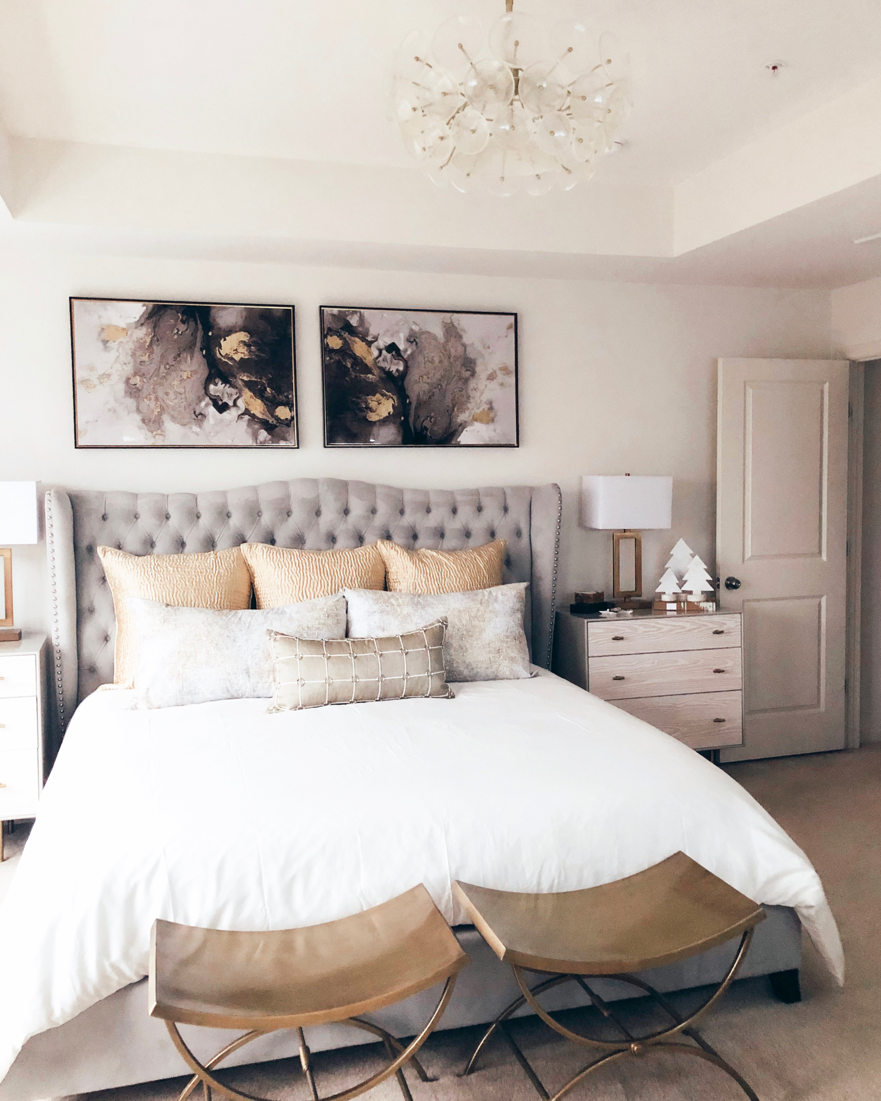 Chandelier, nightstands, duvet cover, lumbar pillow, pillow cases, lamps and euro pillow shams on sale