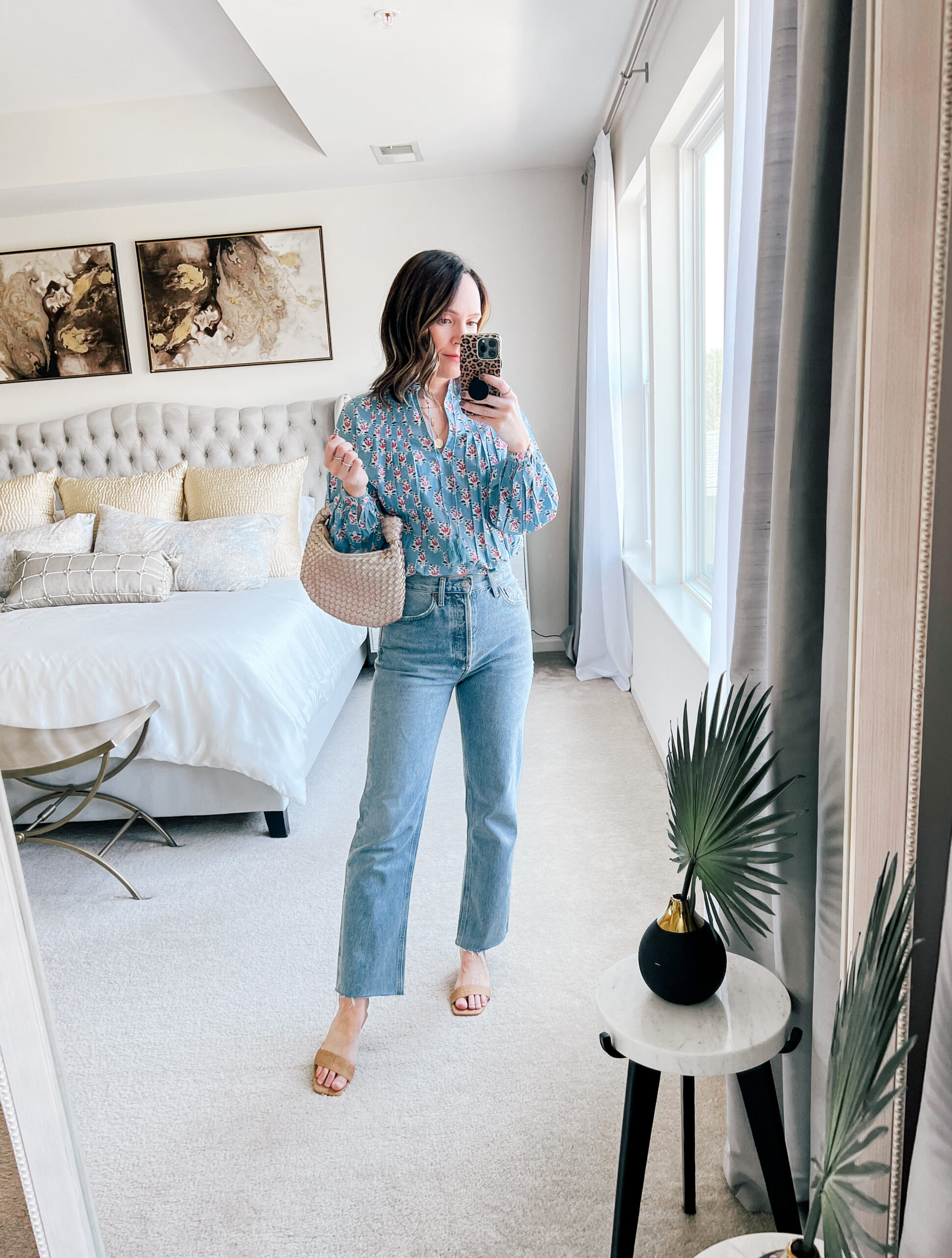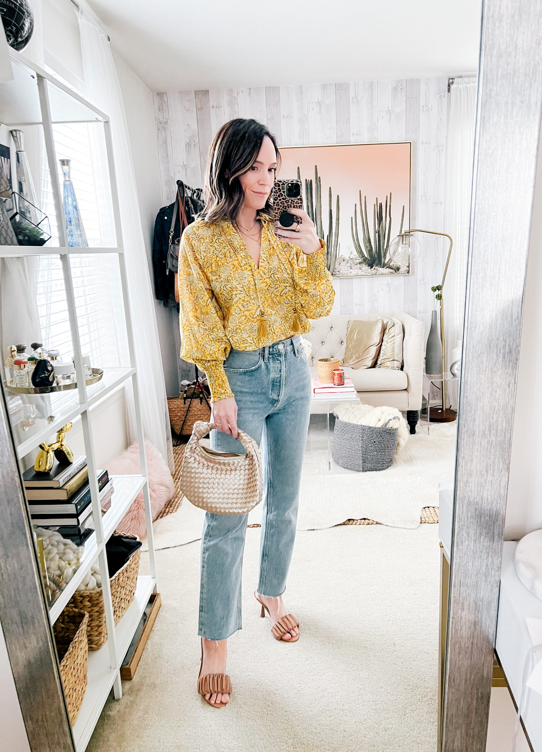 Shirt – Anthropologie | Jeans – Agolde | Bag – Melie Bianco | Sandals – LPA