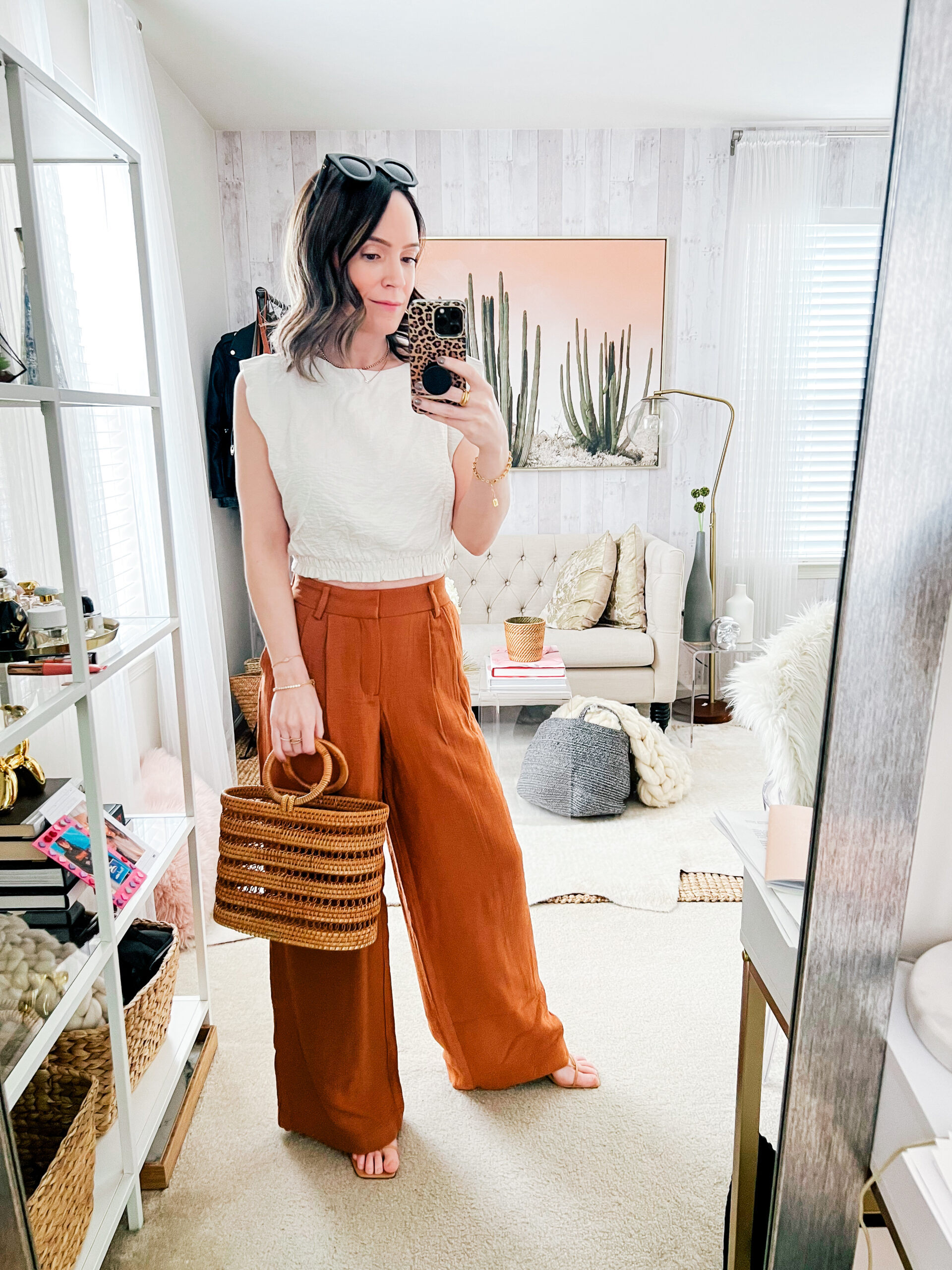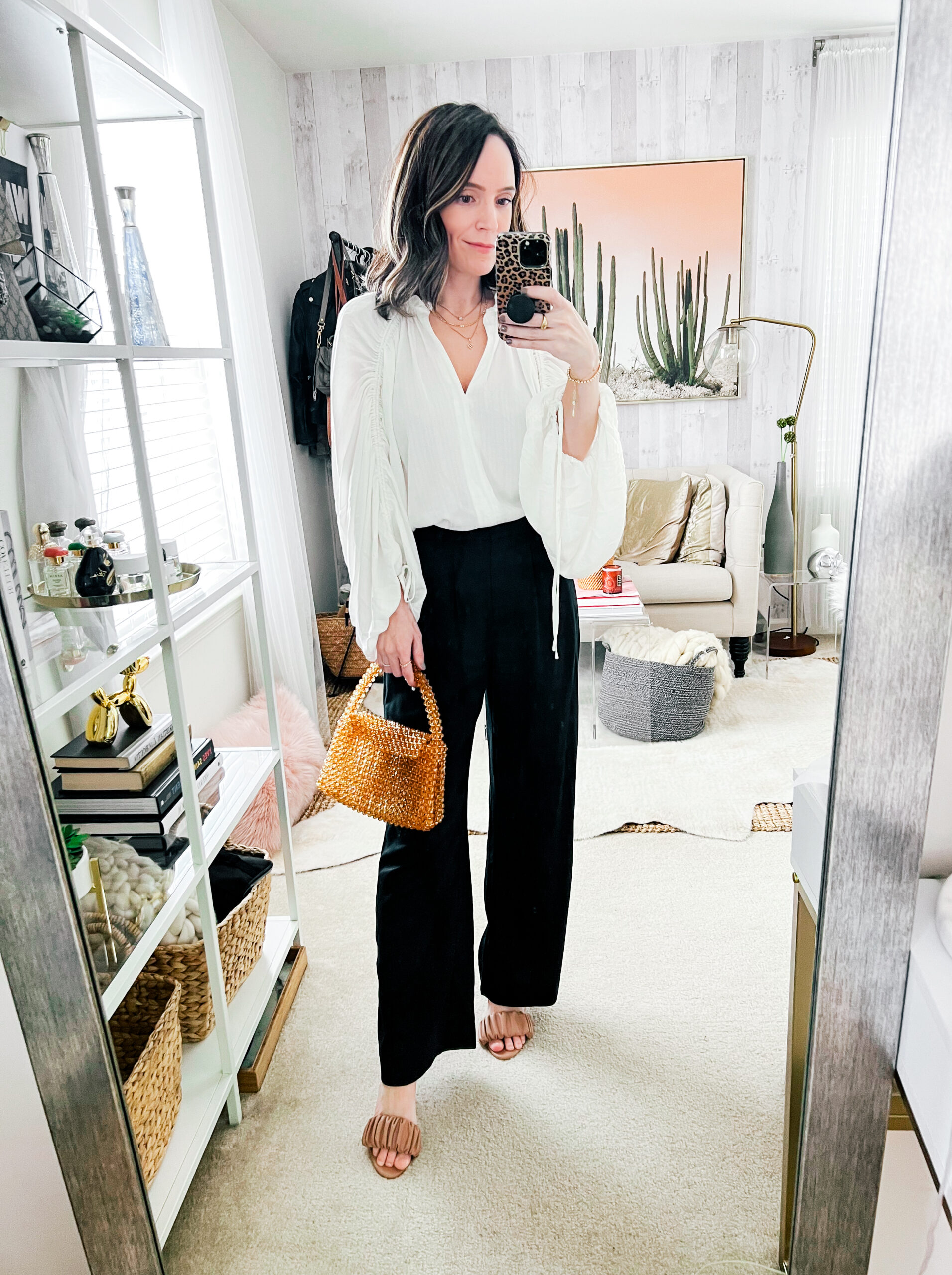 Top – Anthropologie | Pants – Abercrombie | Sandals – LPA | Bag – Melie Bianco