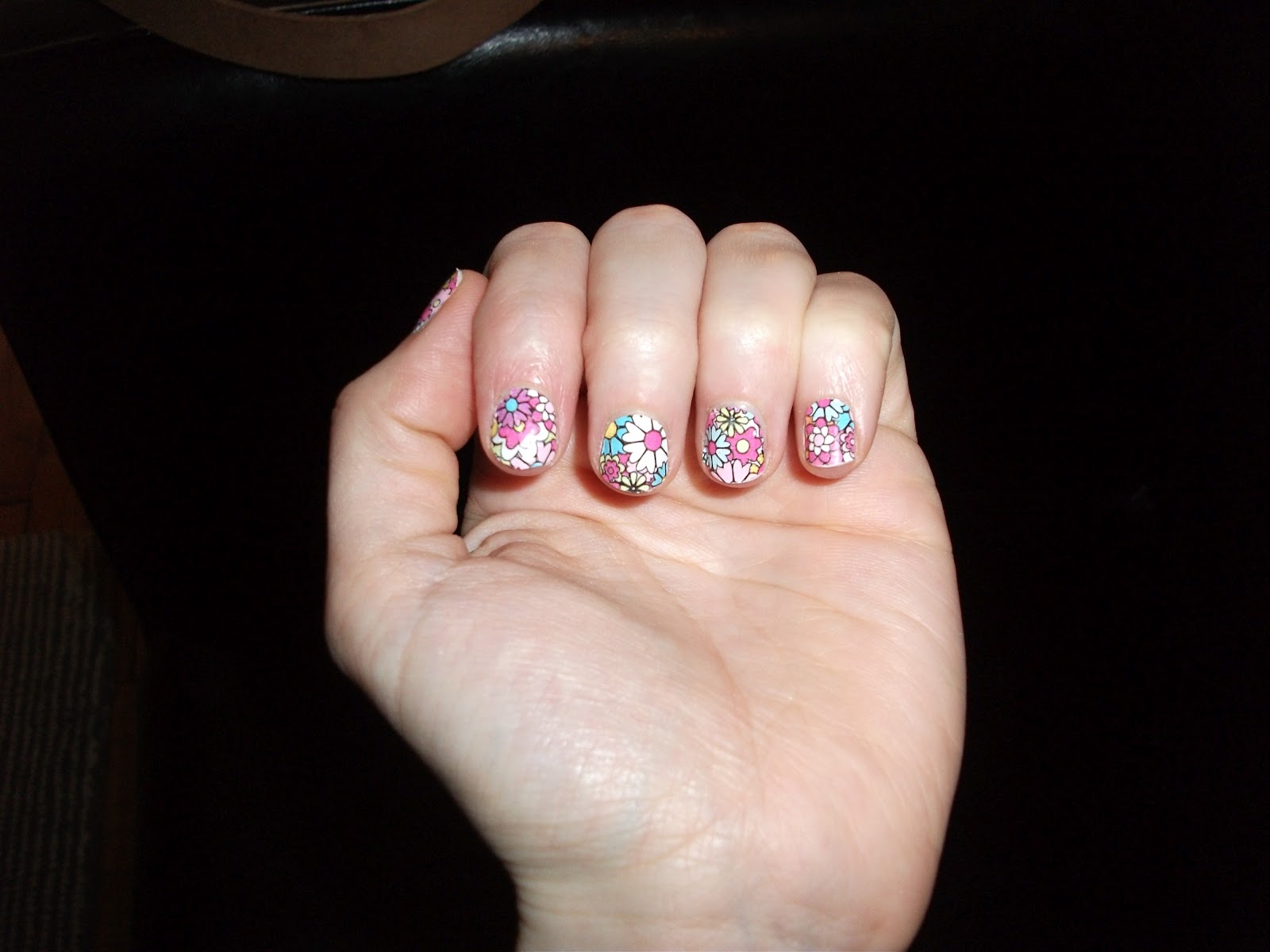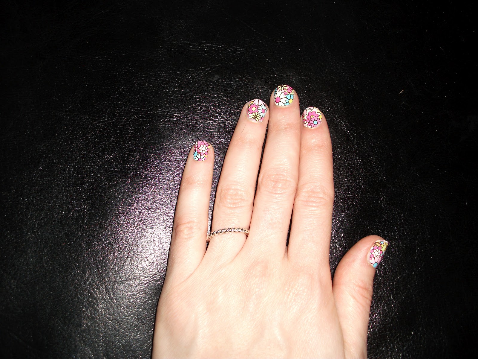 I cleaned my nails, washed my hands and met my challenge head on! Surpisingly, as they claimed, the strips were very easy to apply and adhered immediately to my nails. Once they adhere to the nail, you need to file off the excess strip. This is where I found it slightly difficult, and struggled to avoid chipping or wrinkling the strip. But after you get one or two fingers done, the process gets easier……for my left hand that is. I breezed through the strips on my left hand and then stopped, realizing the daunting task of doing my right hand was still before me. At this point I contemplated just throwing in the towel and starting a new trend. ?But they looked so darn cute that I just had to finish. So it took me a little longer, but both hands got done and looked super cute.