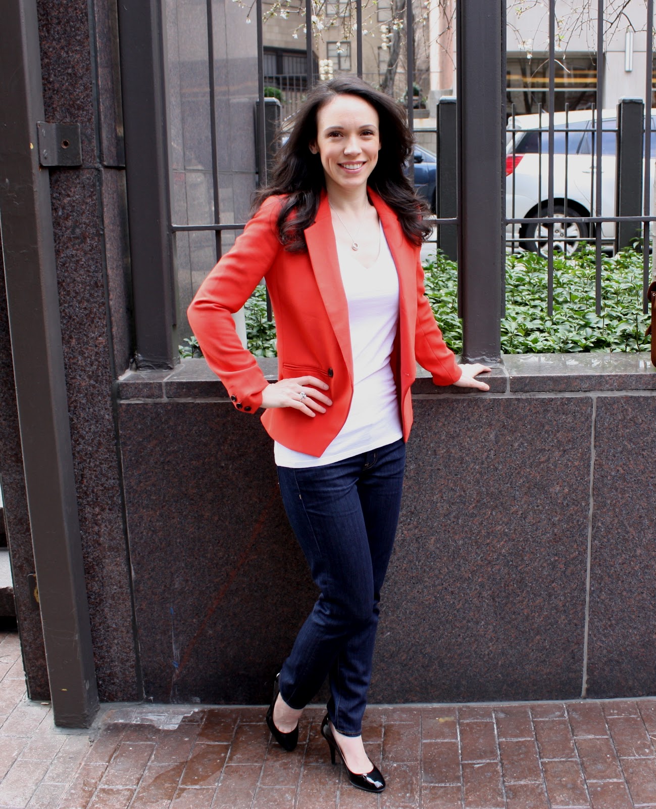 Outfit 1: Banana Republic Blazer | Club Monaco Tee | J.Crew Ankle Stretch Toothpick Jeans | Sergio Rossi Pumps | Cambridge Satchel |Outfit 2: Madewell Blazer | J. Crew Mona Pumps | Outfit 3: Club Monaco Blazer