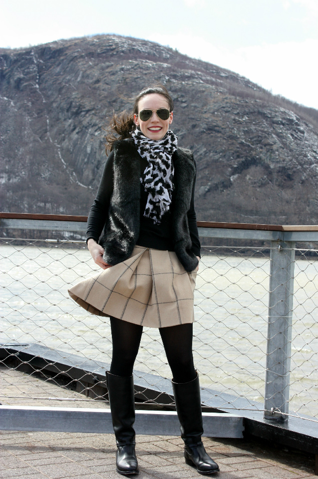 Vest – Club Monaco | Turtleneck – Banana Republic | Scarf – Ann Taylor | Skirt – Club Monaco | Boots – Frye | Tights – Simply Vera by Vera Wang | Sunglasses – Ray Ban