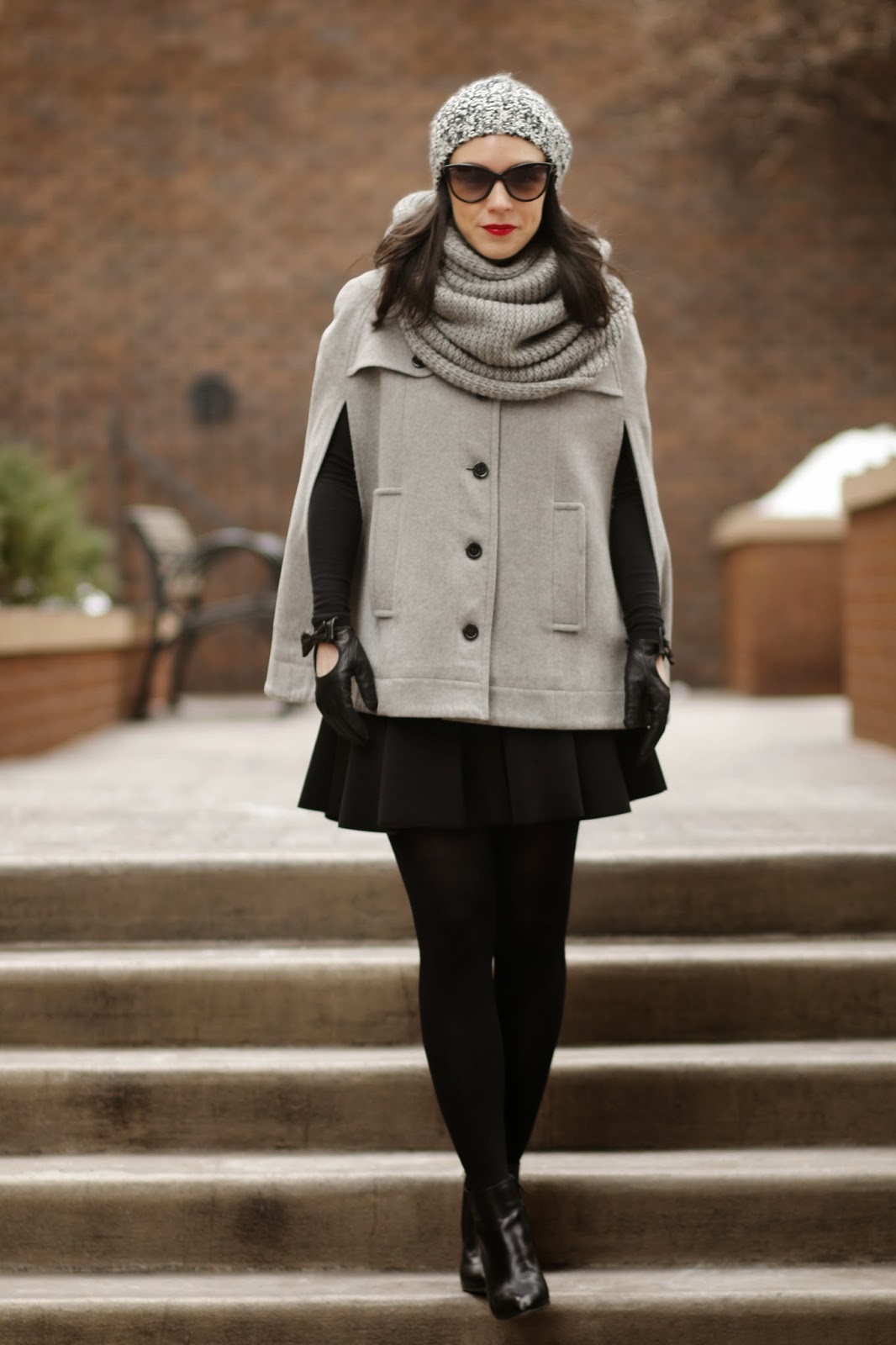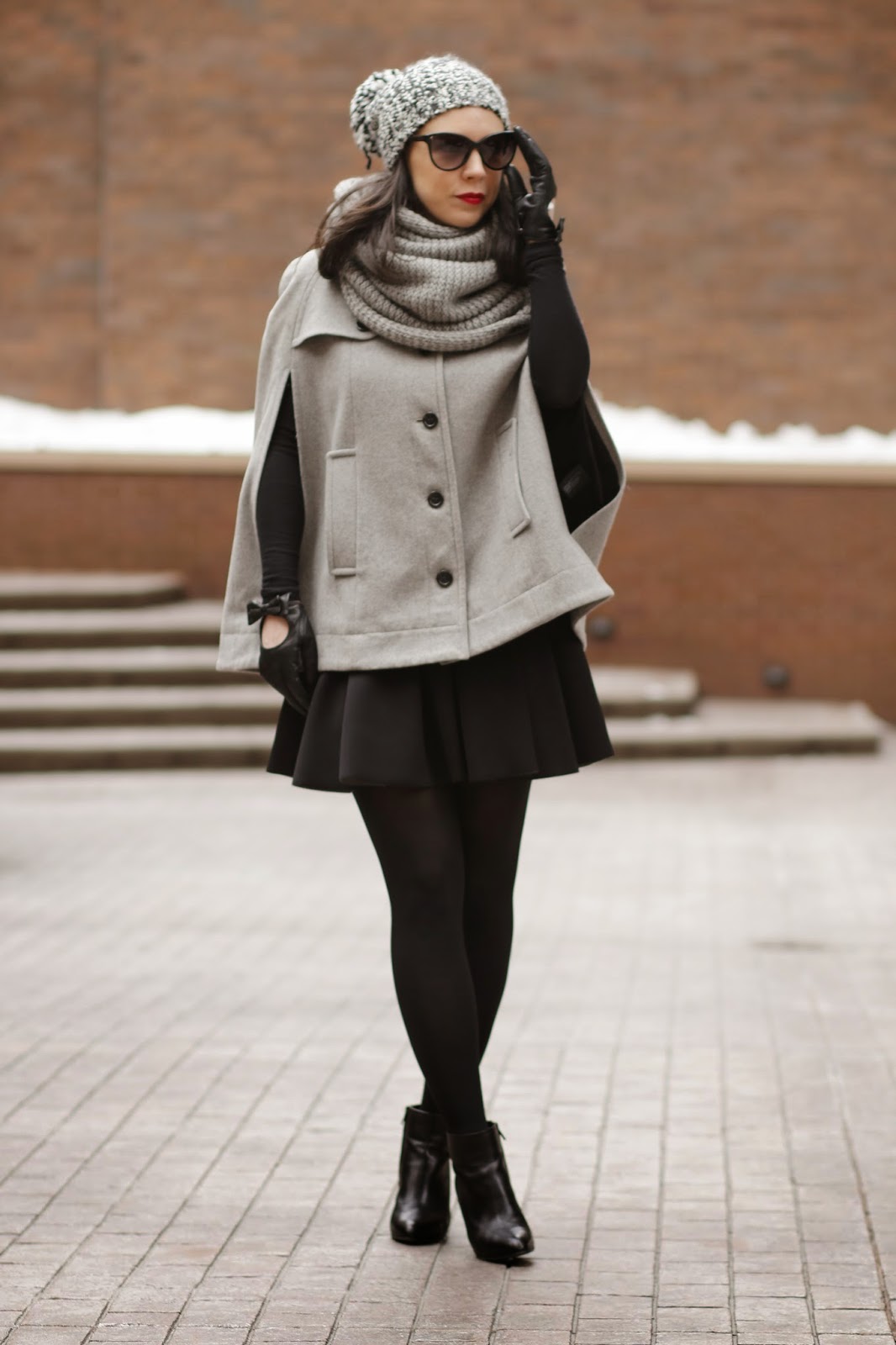 Cape – Club Monaco (similar here and here) | Turtleneck – Club Monaco | Skirt – T by Alexander Wang | Hat – Club Monaco | Boots – J.Crew (similar here and here) | Gloves – Carolina Amato | Tights – Simply Vera | Sunglasses – Stella McCartney | Scarf – Club Monaco (similar here and here)| Lips – Guerlain KissKiss in Red Passion