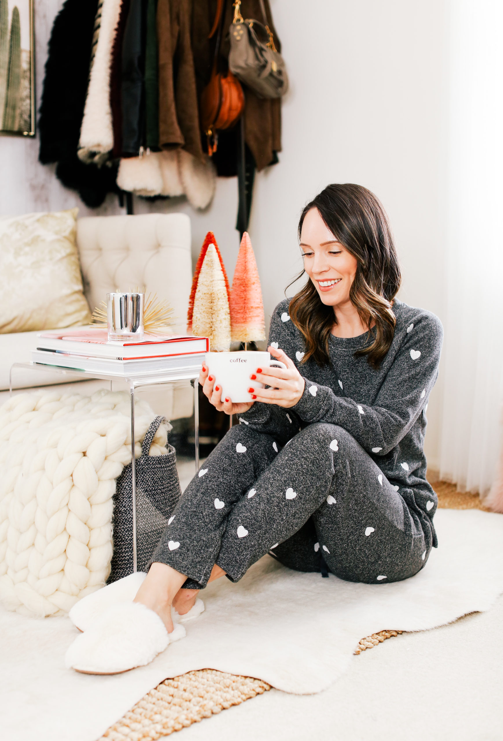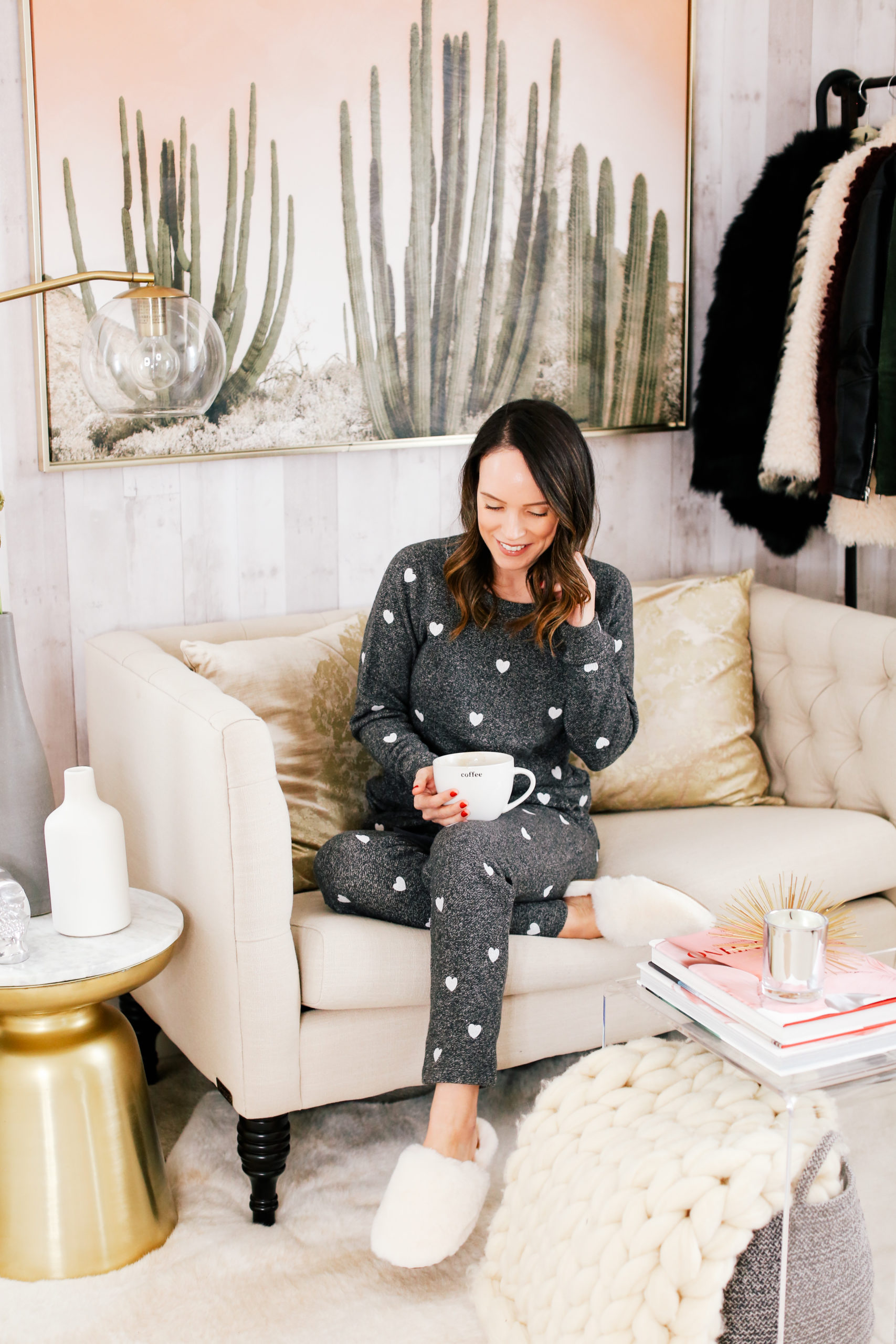 Sweatshirt (40% off today!!) | Sweatpants (40% off today!) | Slippers (mine are sold out but these are very similar) | Lamp | Rug | Side table | Cactus art | Clear nesting tables | Chunky blanket | Settee (similar)