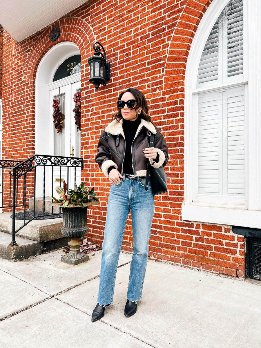 Outfit details: Jacket | Jeans | Sweater (discount code: MAREE10) | Belt | Bag | Shoes | Sunglasses | Necklace