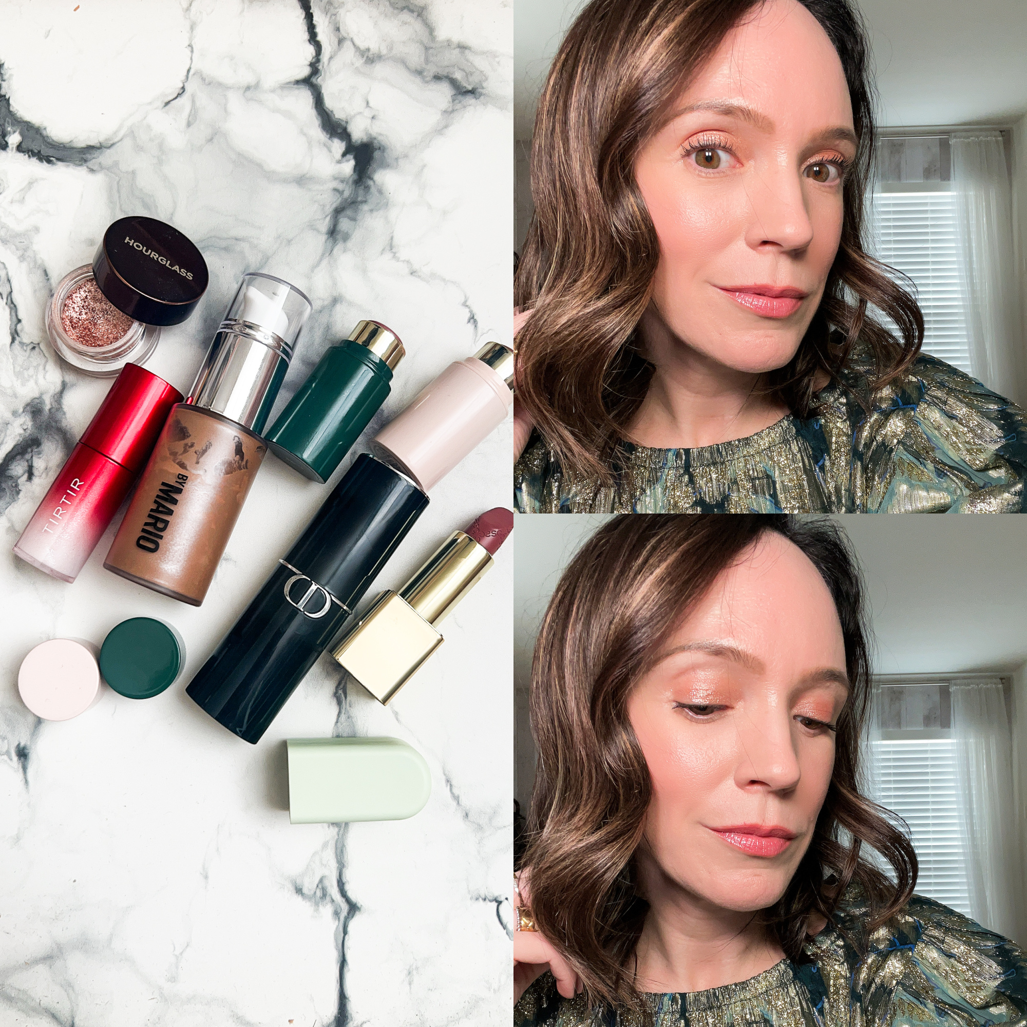 I LOVE this Jones Road Beauty eyeshadow in Rose Gold as it is a very pigmented glitter eyeshadow. A great choice for a holiday makeup look. Another gorgeous option would be the Hourglass Scattered Light eyeshadow in Reflect. I love a solo eyeshadow versus an eyeshadow palette because it can keep the look so simple. And I don’t add any additional eye liner or any darker shade to the outer corner because my preference is to keep the eye look radiant and bright. I add a few coats of my favorite Tarte Tubing Mascara and define my brows with the Jones Road Beauty Brow Gel in Light Brunette.