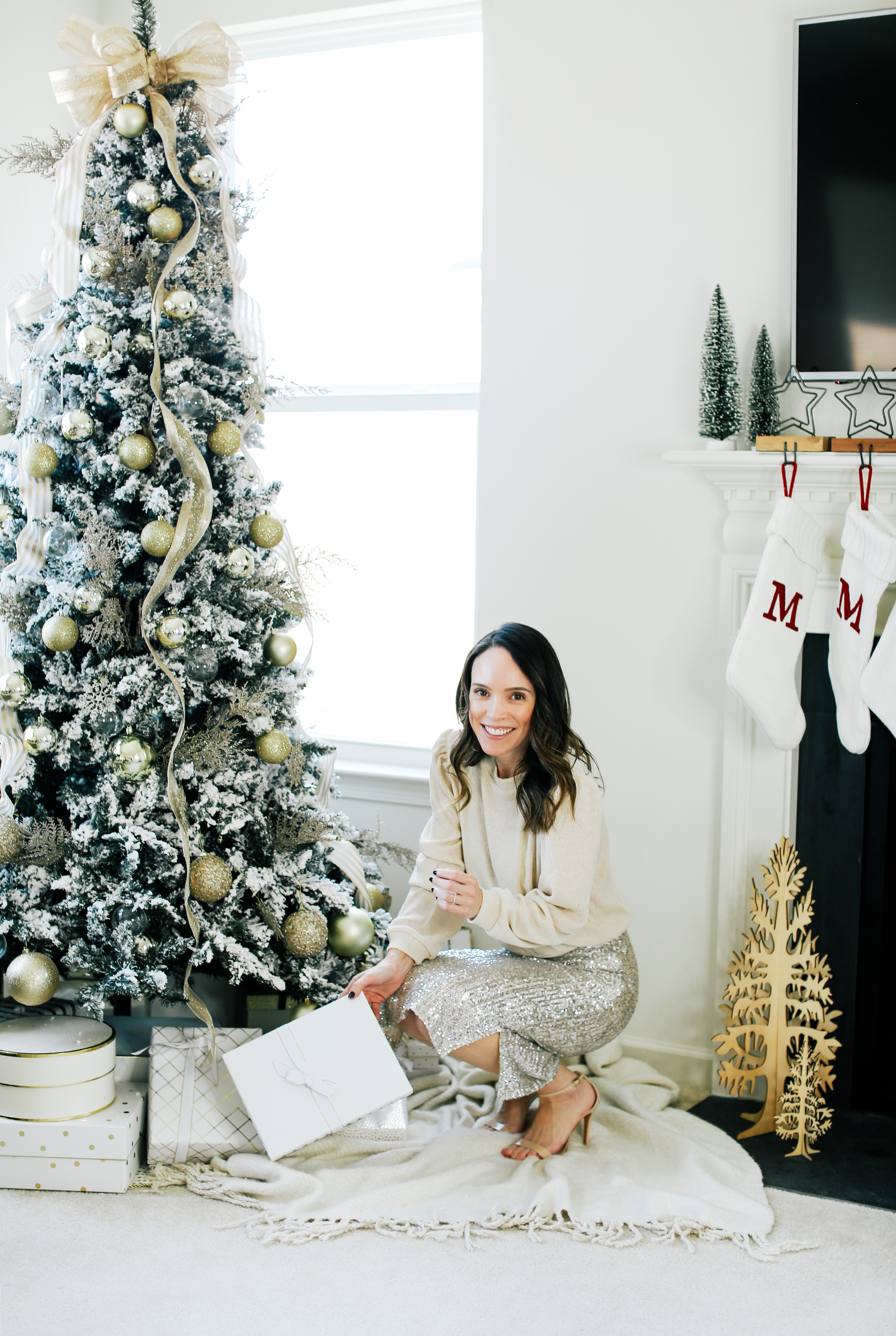 Sweater – Mango (on sale!) | Skirt – Mango (on sale!) | Sandals – Schutz | Earrings – 8 Other Reasons | Christmas Tree – Hayneedle (on sale too!)