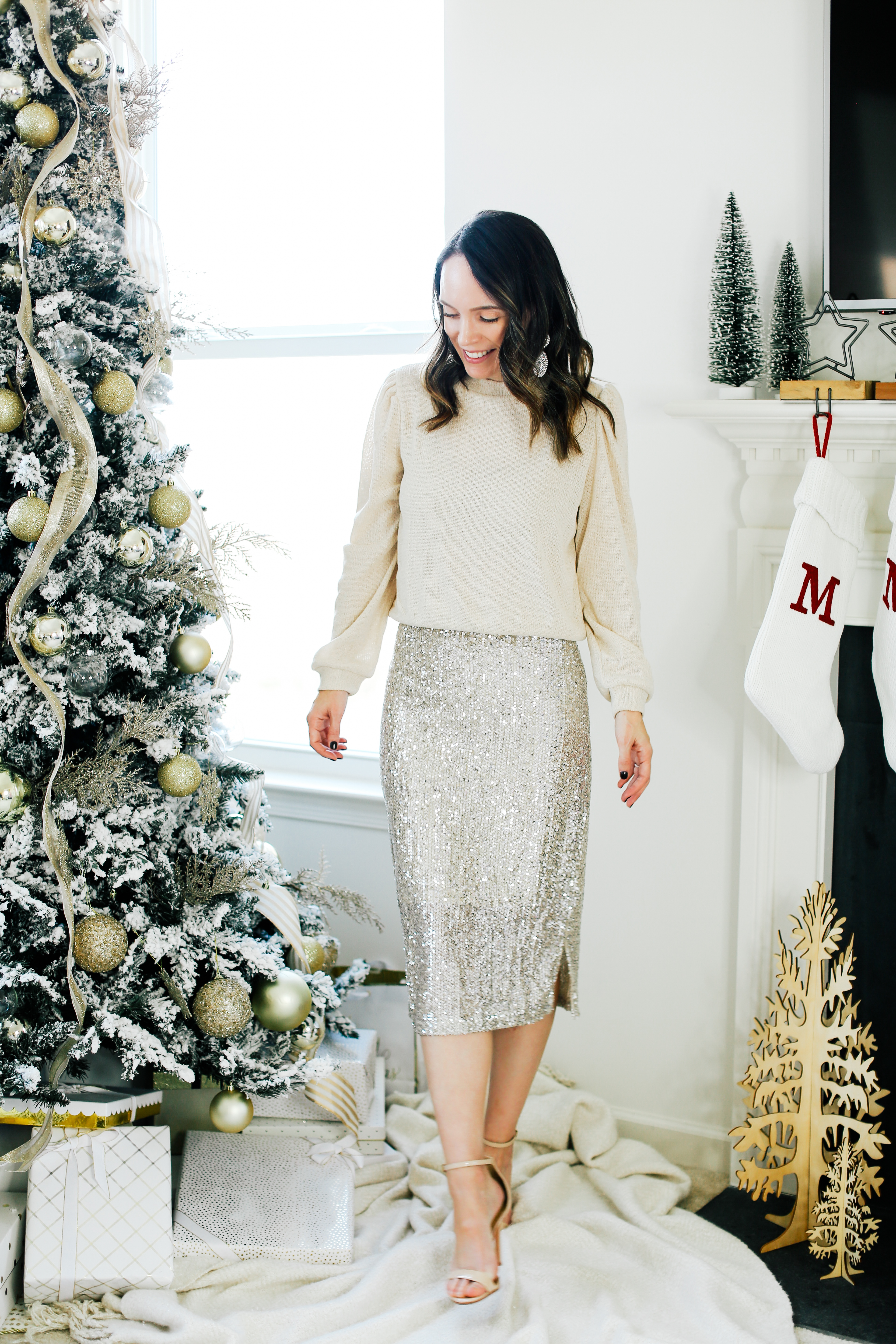 The season of sequins is now here! Ha! I am absolutely IN LOVE with this look and think it is so chic and elegant for a holiday soiree. The sequined skirt fits beautifully and is so flattering. I paired it with a puff sleeve sweater mainly because I love that I can still wear the sweater for many more months to come. I’m so sad my earrings sold out so quickly because they are the most perfect style for the holiday season. I will keep checking to see if they come back in stock and share if they do. Holiday party looks was the most requested thing from all of you for this season so I definitely have a good variety of outfits to fit all sorts of occasions. Here is a look for a holiday night out with friends and an office party. I have shared a few other looks on my Instagram that I will round up all in one blog post very soon.