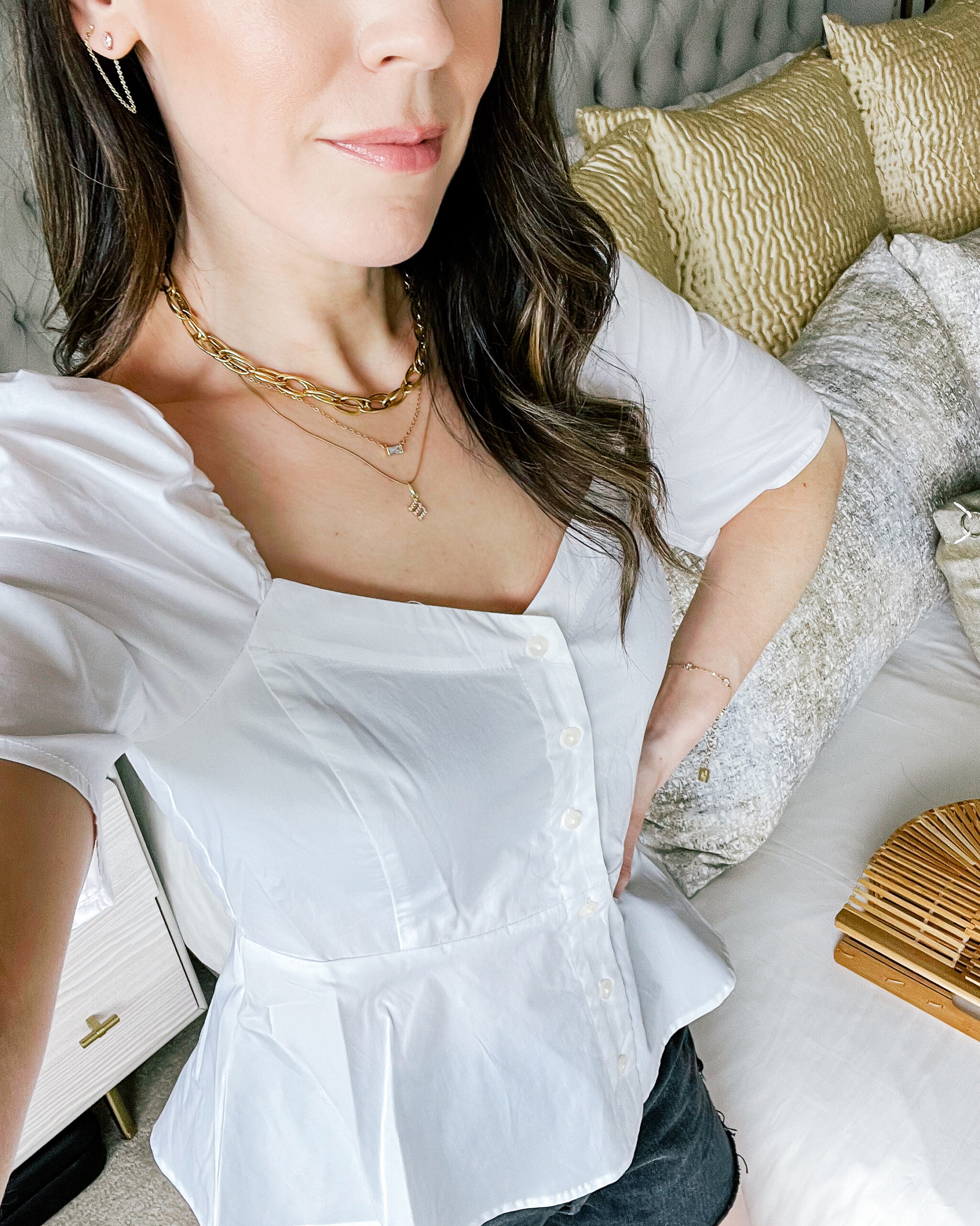 Top – GAP | Necklaces – Miranda Frye here, here, here and here | Earrings – Miranda Frye | Bag – Cult Gaia | Bracelet – Miranda Frye