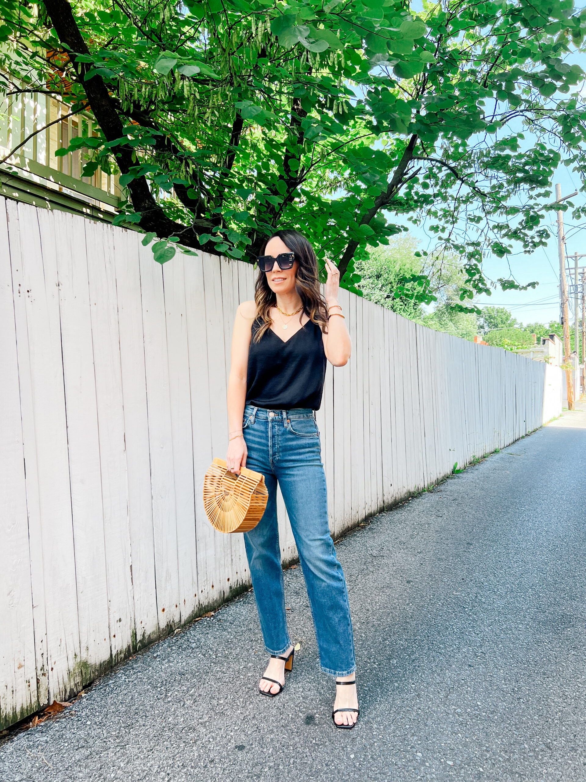 Camisole – Express (similar) | Jeans – Redone | Sandals – Amazon | Bag – Cult Gaia | Sunglasses – Amazon | Necklaces – Gorjana and Miranda Frye