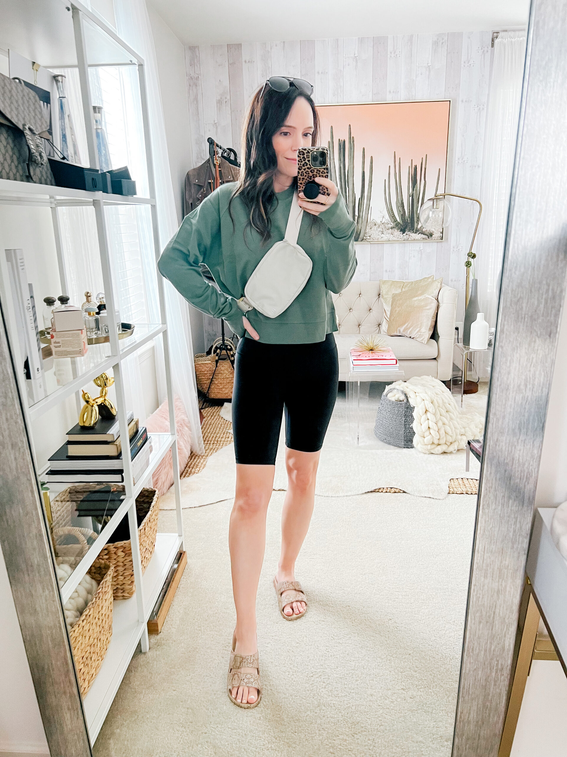 Sweatshirt – Sweaty Betty | Biker shorts – Lululemon | Bag – Lululemon | Sandals – Freedom Moses | Sunglasses – Hawkers