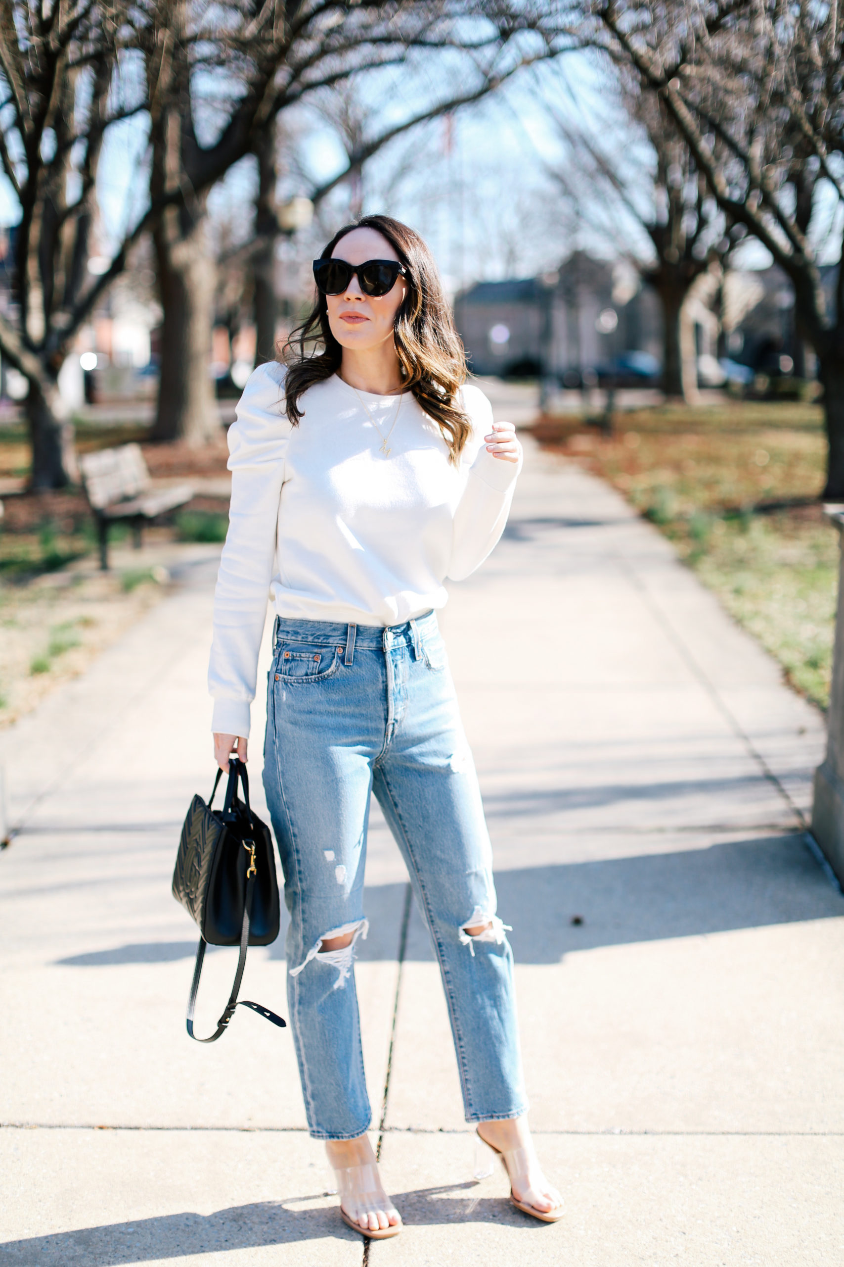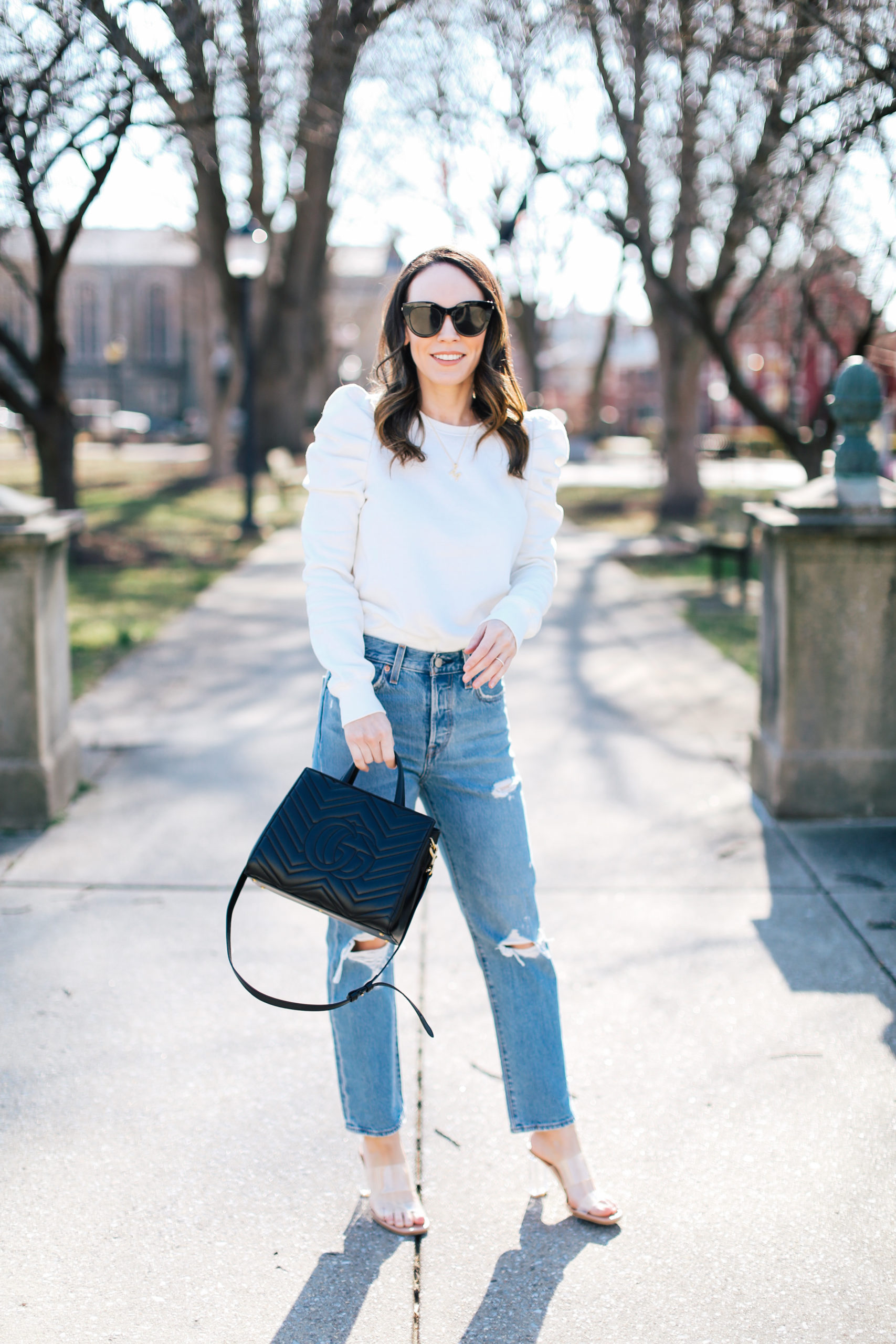 Sweatshirt – Rebecca Minkoff | Jeans – Levi’s (runs TTS, no stretch however) | Shoes – Zara (similar here) | Bag – Gucci | Sunglasses – Le Specs | Necklace – Adornmonde | Earrings – Natalie B Jewelry