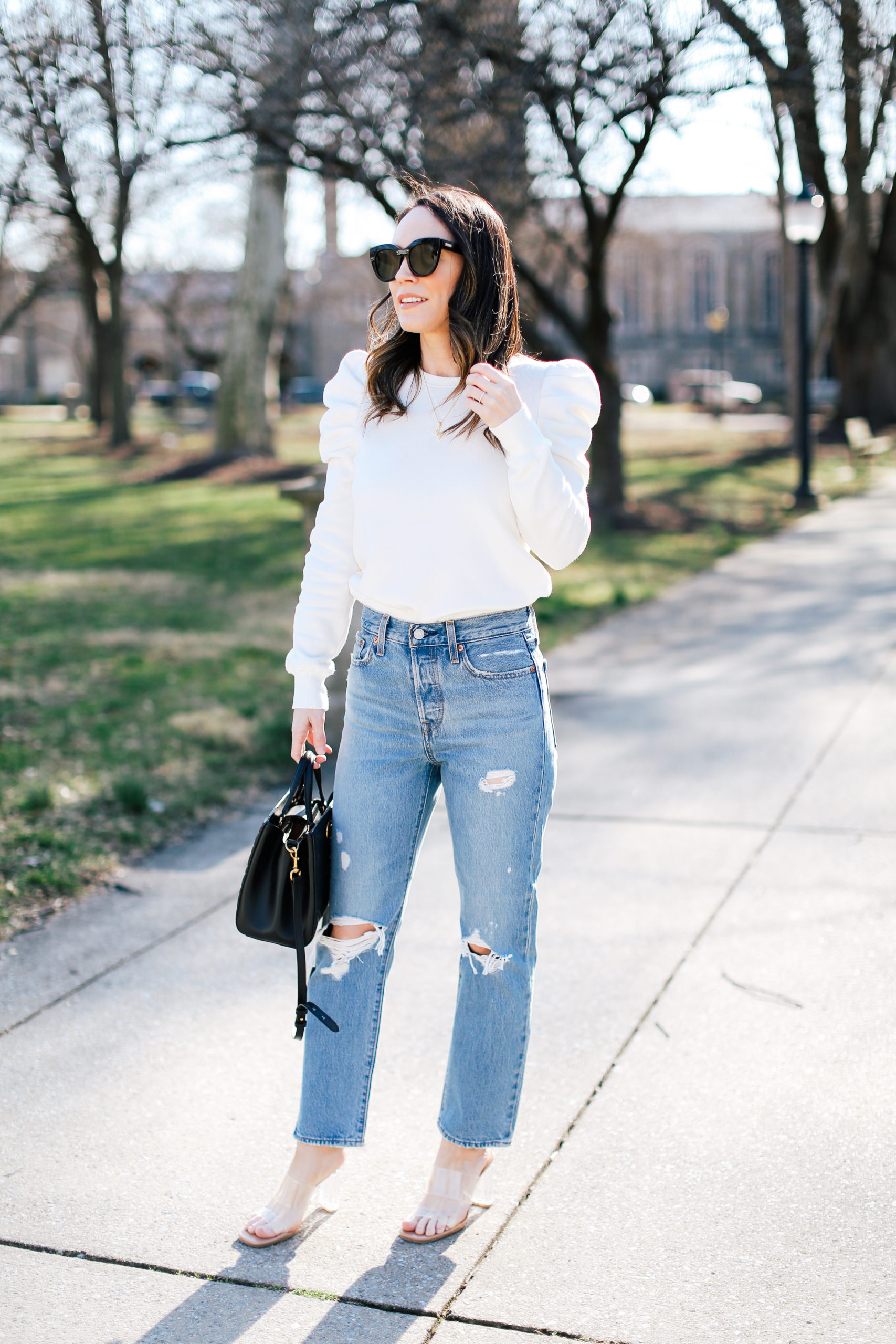 I am really loving the straight leg denim look right now – it’s a new style for me but it’s growing on me! I have this same style of Levi’s in a non-distressed version and love them, but I will always be a sucker for jeans with holes in them. LOL The Shopbop sale is in full swing and these Levi’s and sweatshirt are both included in the event. The sweatshirt comes in a few different colors and is such a cute take on a regular ol’ sweatshirt. The puffy sleeves are just puffy enough that they look feminine but don’t add bulkiness to your shoulders and make you look like a linebacker. Ha! And you can bet that I will be wearing the heck outta my clear heels again this year. They go with just about any look. There are quite a few included in the Shopbop sale if you want to try a pair this spring/summer – these flip flops, these sandals and these heels.