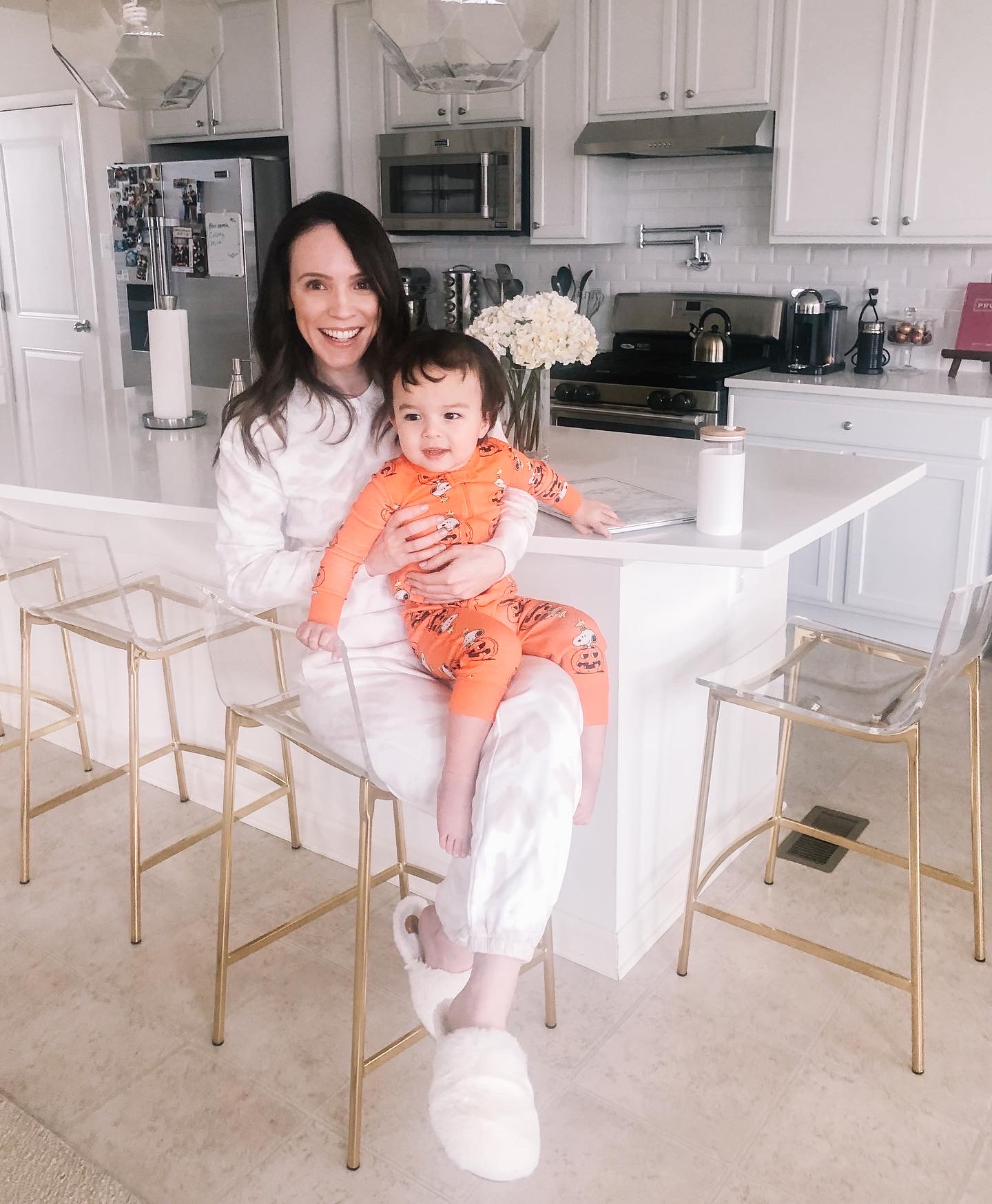 Sweatshirt and sweatpants – Madewell | Slippers – Anthropologie (similar here) | Miles’ pajamas – Hanna Andersson | Bar stools – CB2 | Pendant lamps – CB2