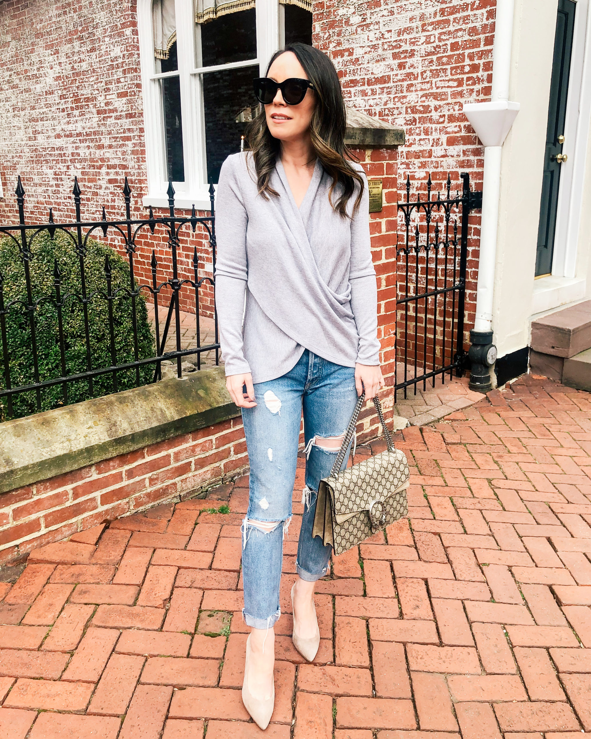 Sweater – 1.State | Jeans – Grlfrnd | Heels – Coach (similar here) | Bag – Gucci | Sunglasses – Le Specs