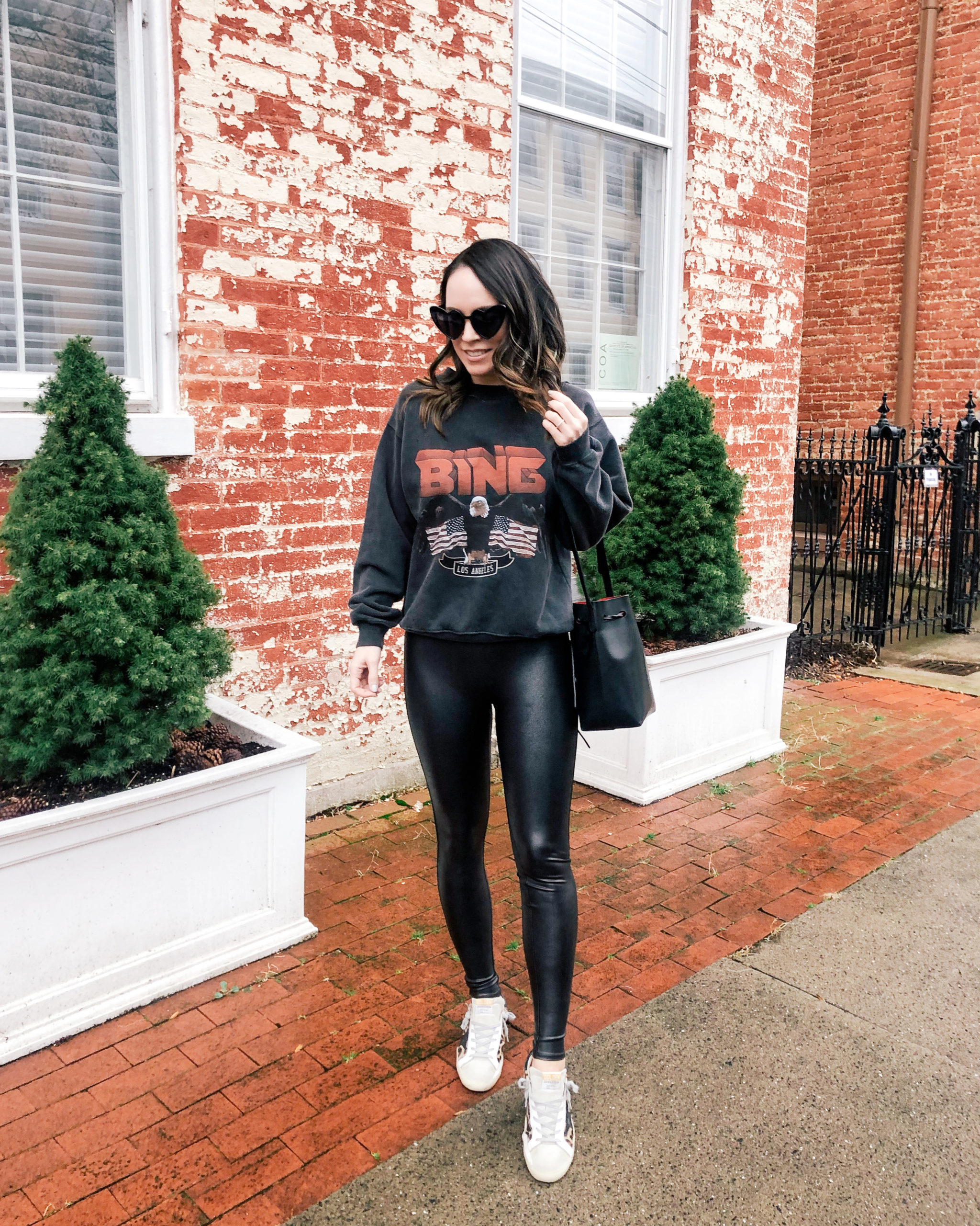 Sweatshirt – Anine Bing | Leggings – Spanx | Sneakers – Golden Goose (here are a great Golden Goose sneaker dupe) | Bag – Mansur Gavriel | Sunglasses – Amazon