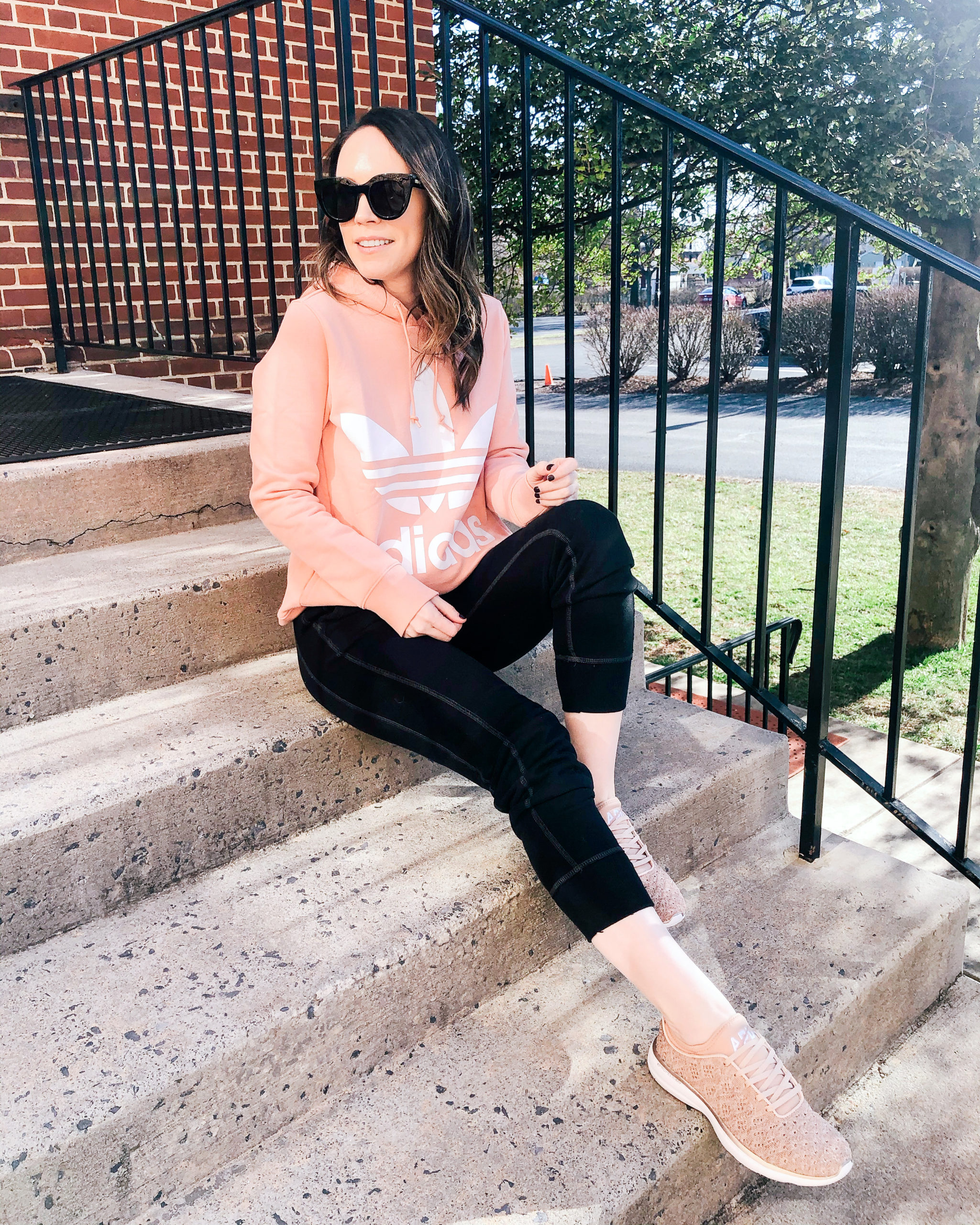 Sweatshirt – Adidas | Joggers – Abercrombie | Sneakers – APL | Sunglasses – Le Specs