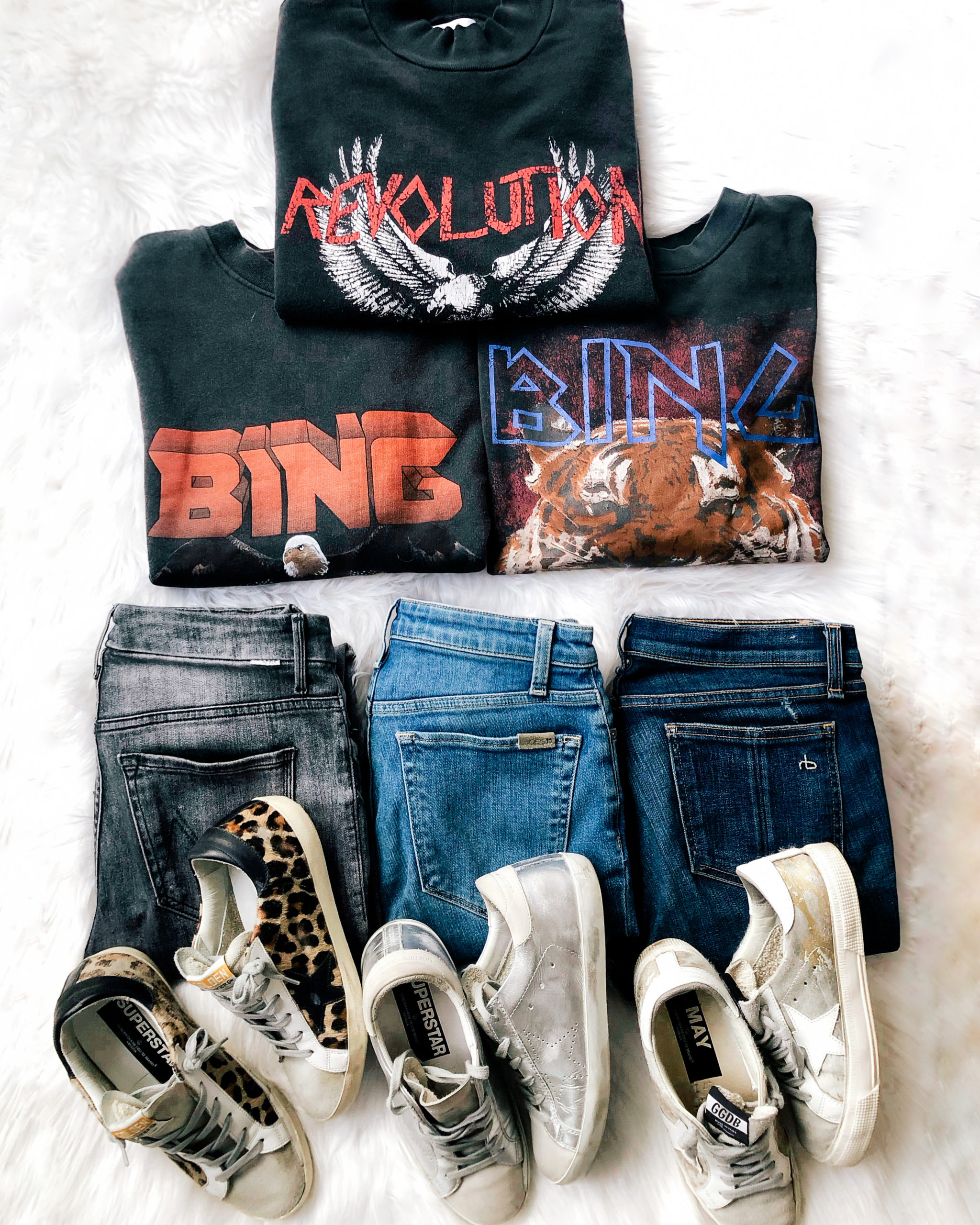 Sweatshirts – Anine Bing (top, left, right) | Jeans – Mother Denim, Joe’s Jeans, Rag & Bone | Sneakers – Golden Goose (leopard, silver (similar), neutral (similar)