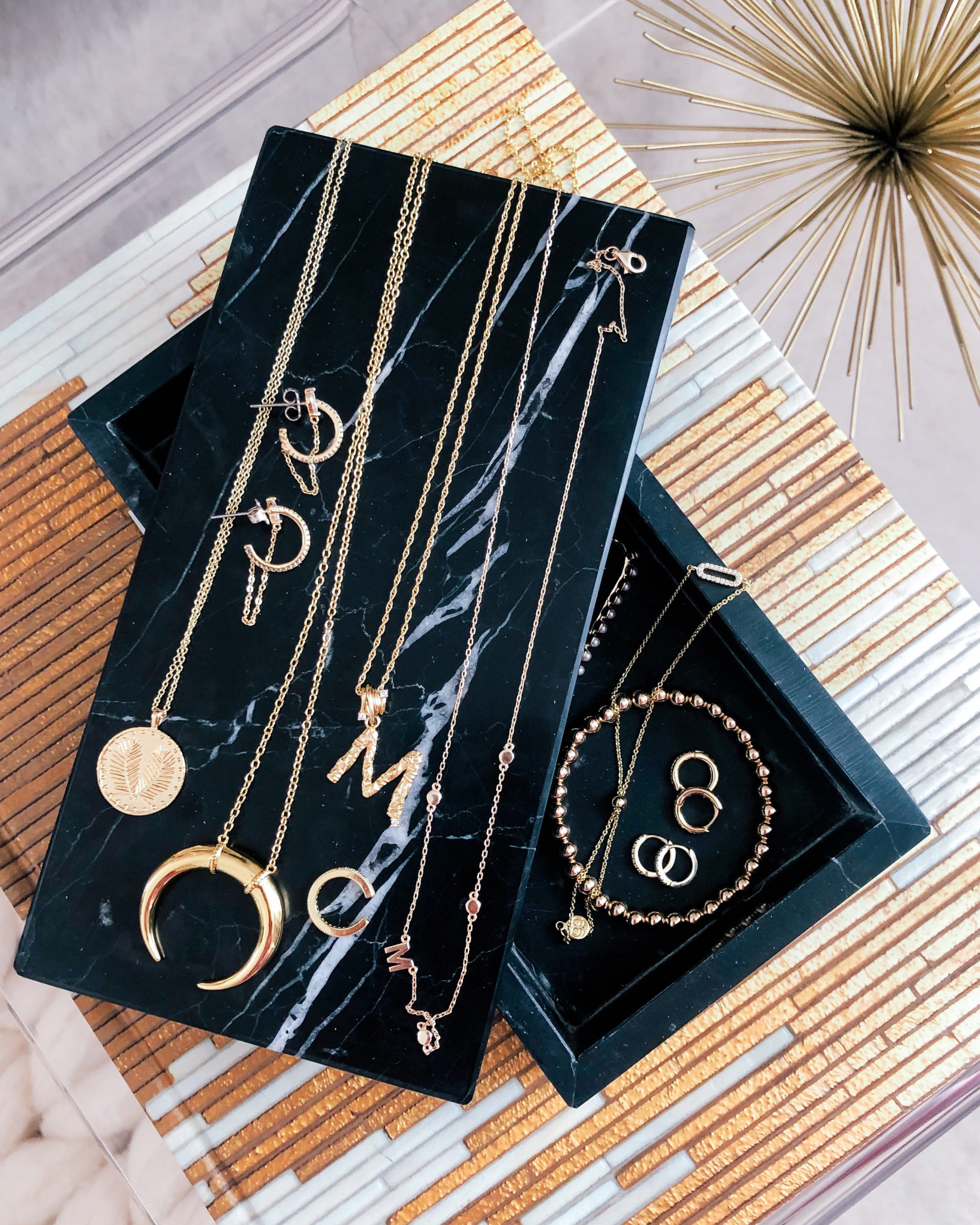 Coin pendant – Gorjana | Crescent necklace – Gorjana | Large initial necklace – Adornmonde | Small initial necklace – Evereve | Hoop earrings – Nordstrom | Ear cuff – Uncommon James | Chain bracelet – Gorjana | Beaded bracelet – Alexa Leigh | Diamond huggies – Etsy | Gold huggies – Etsy | Marble box – CB2 | Also wear this personalized beaded bracelet with Miles’ name on it from Baublebar