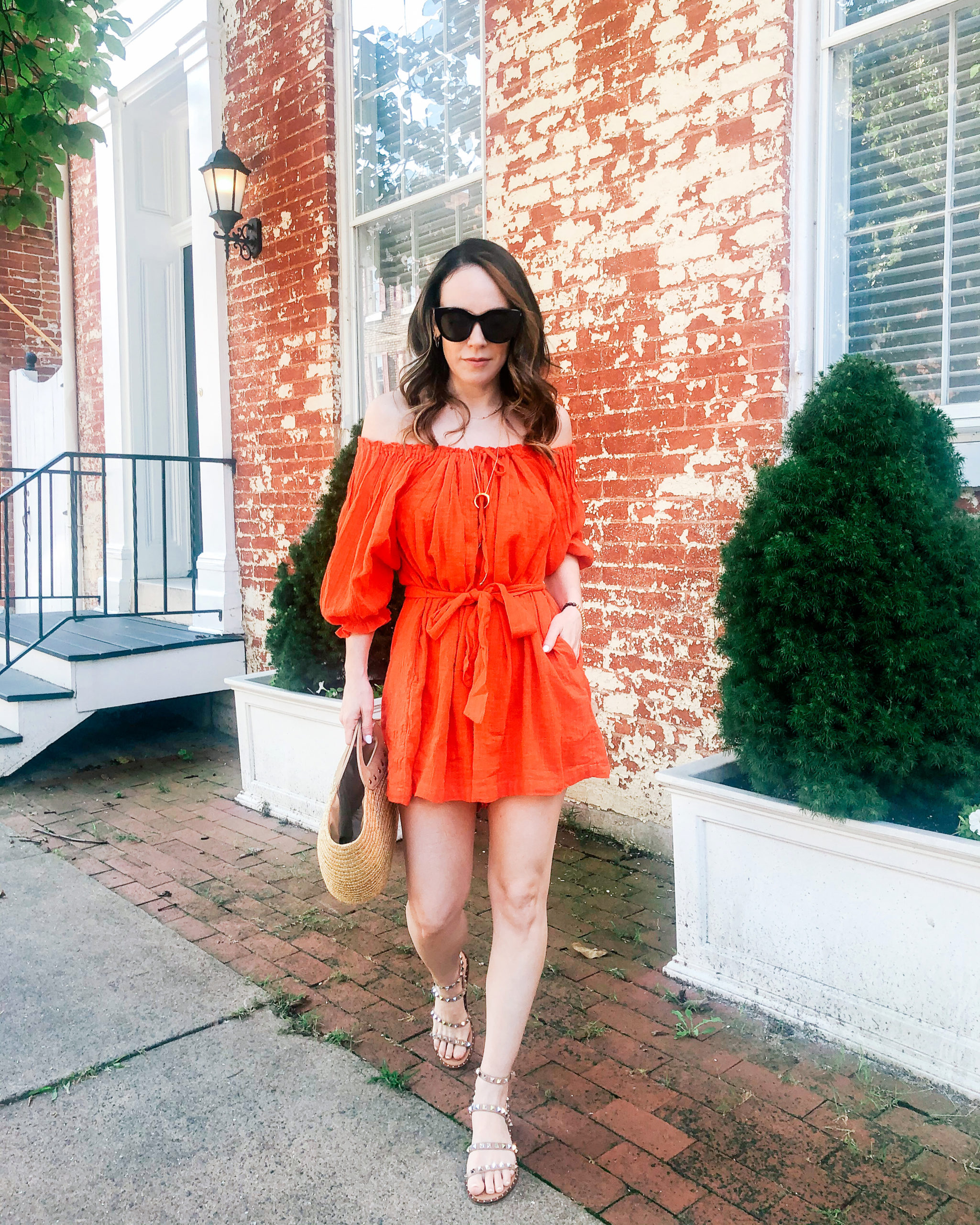Romper – Free People | Sandals – Steve Madden | Bag – Caterina Bertini (similar) | Sunglasses – Le Specs | Earrings – Nordstrom and Etsy | Bracelet – Baublebar | Necklace – Gorjana and Evereve