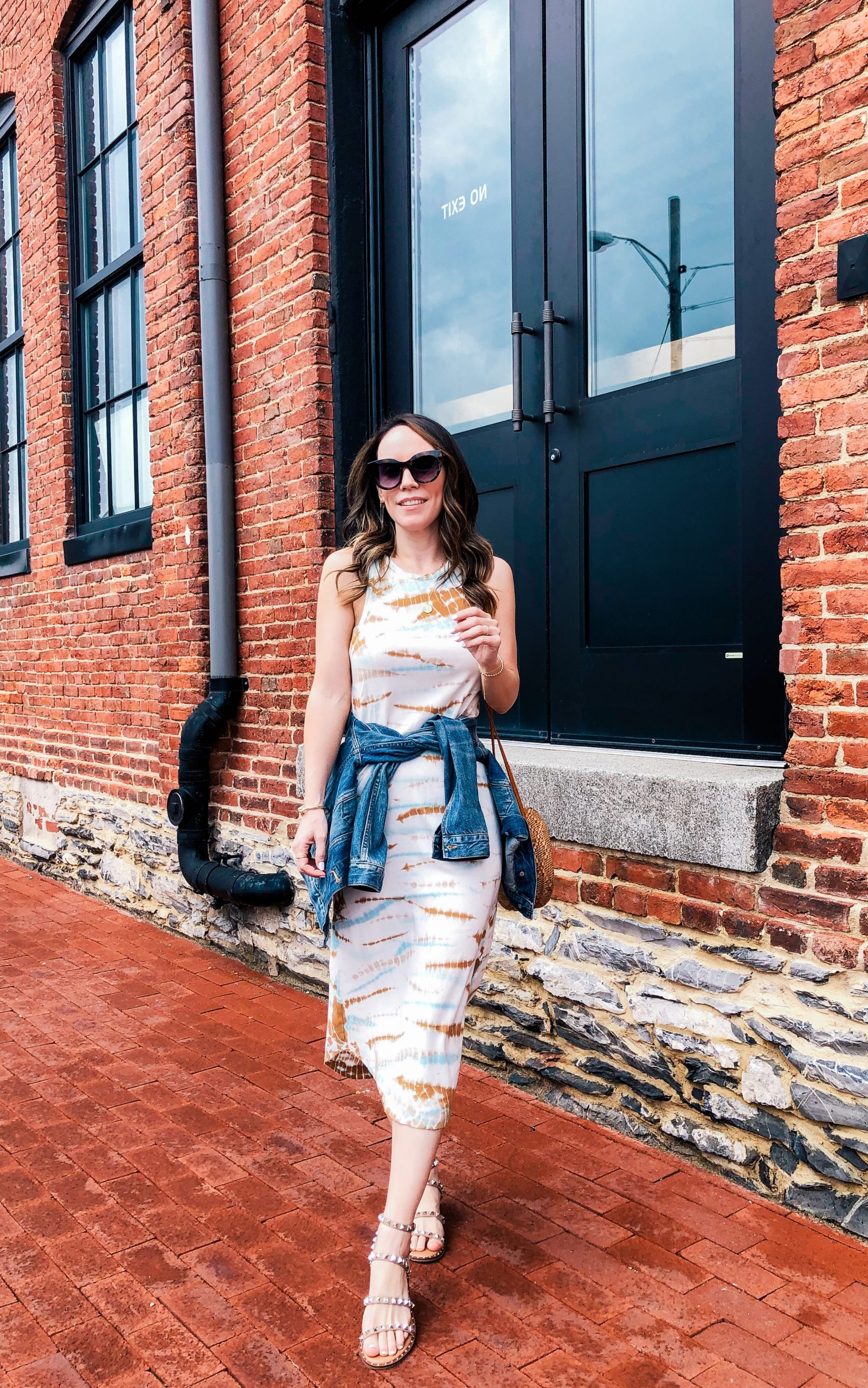 Dress – Young, Fabulous & Broke | Sandals – Steve Madden | Denim jacket – Madewell | Bag – Nordstrom (similar) | Sunglasses – Le Specs | Necklace – Gorjana and Evereve | Bracelets – Alexa Leigh and Gorjana