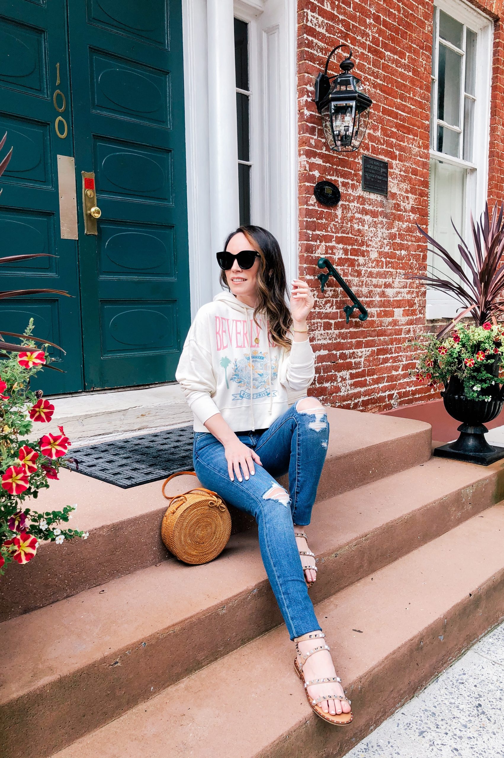 Sweatshirt – Daydreamer | Jeans – Blank NYC | Sandals – Steve Madden | Sunglasses – Le Specs | Bag – Nordstrom (similar) | Necklace – Gorjana and Evereve | Bracelets – Alexa Leigh and Gorjana