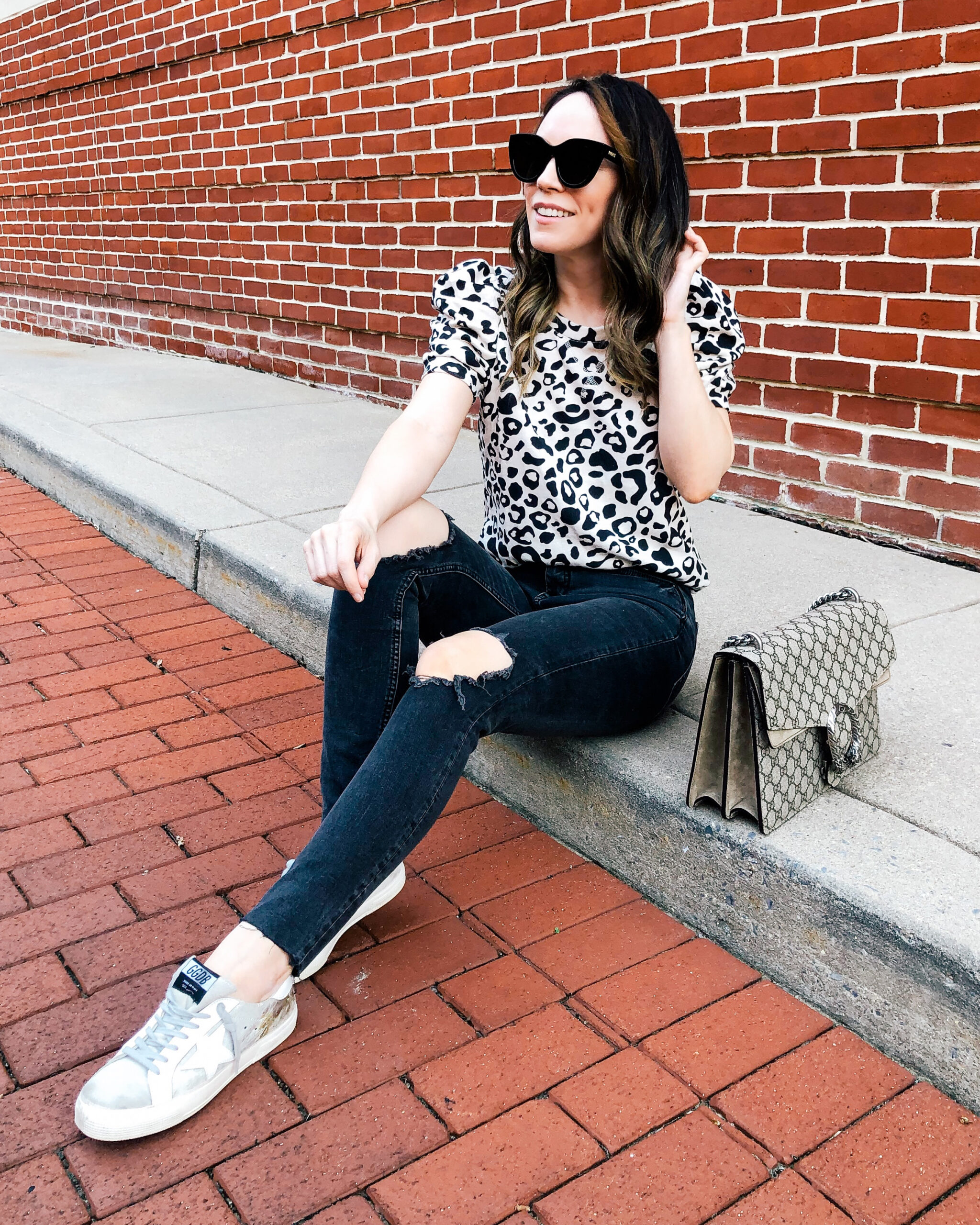 Shirt – Abercrombie | Jeans – Agolde | Shoes – Amazon | Bag – Gucci | Sunglasses – Le Specs