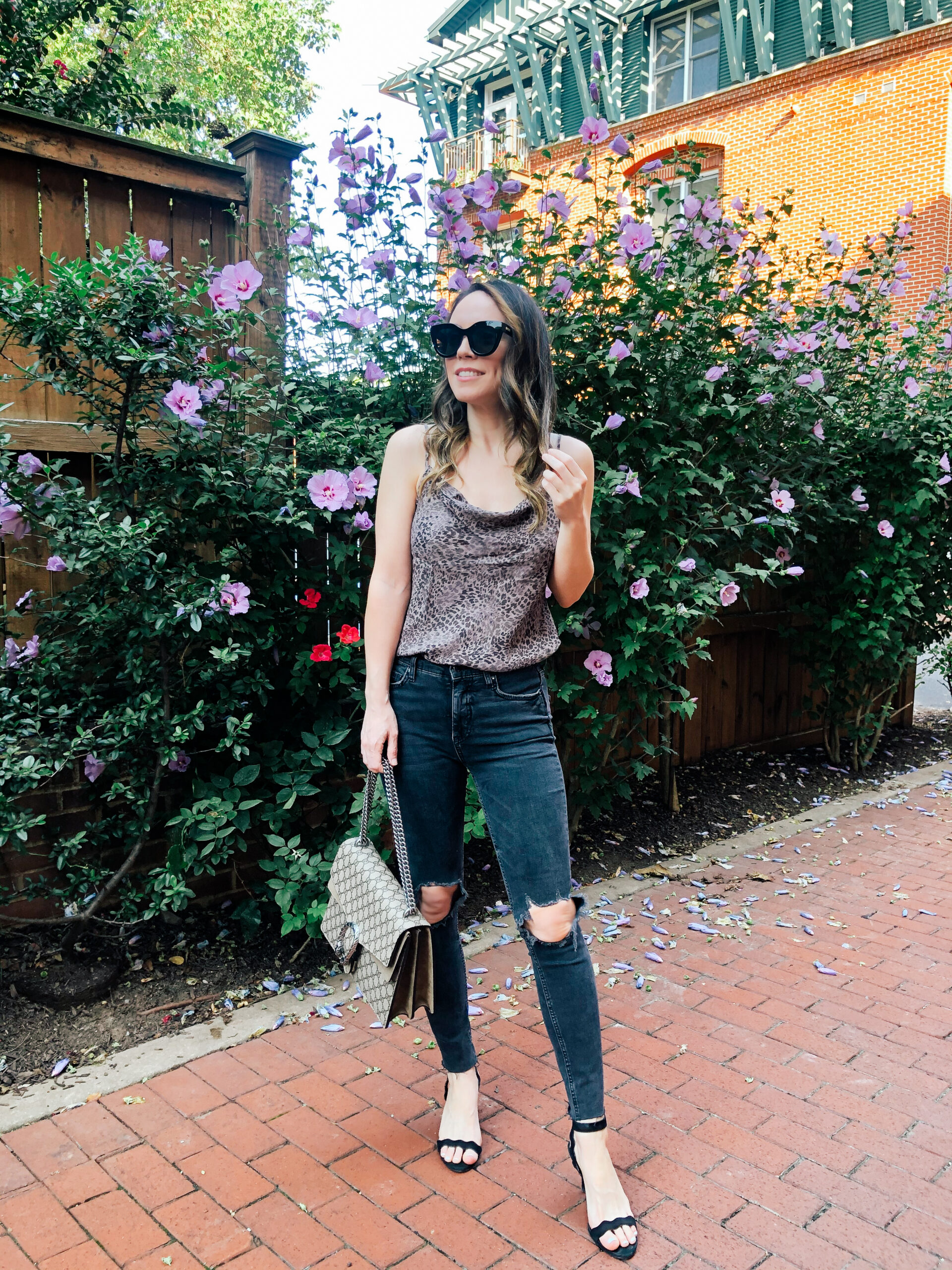 Tank – Target | Jeans – Free People | Sandals – Loeffler Randall (similar) | Bag – Gucci | Sunglasses – Le Specs