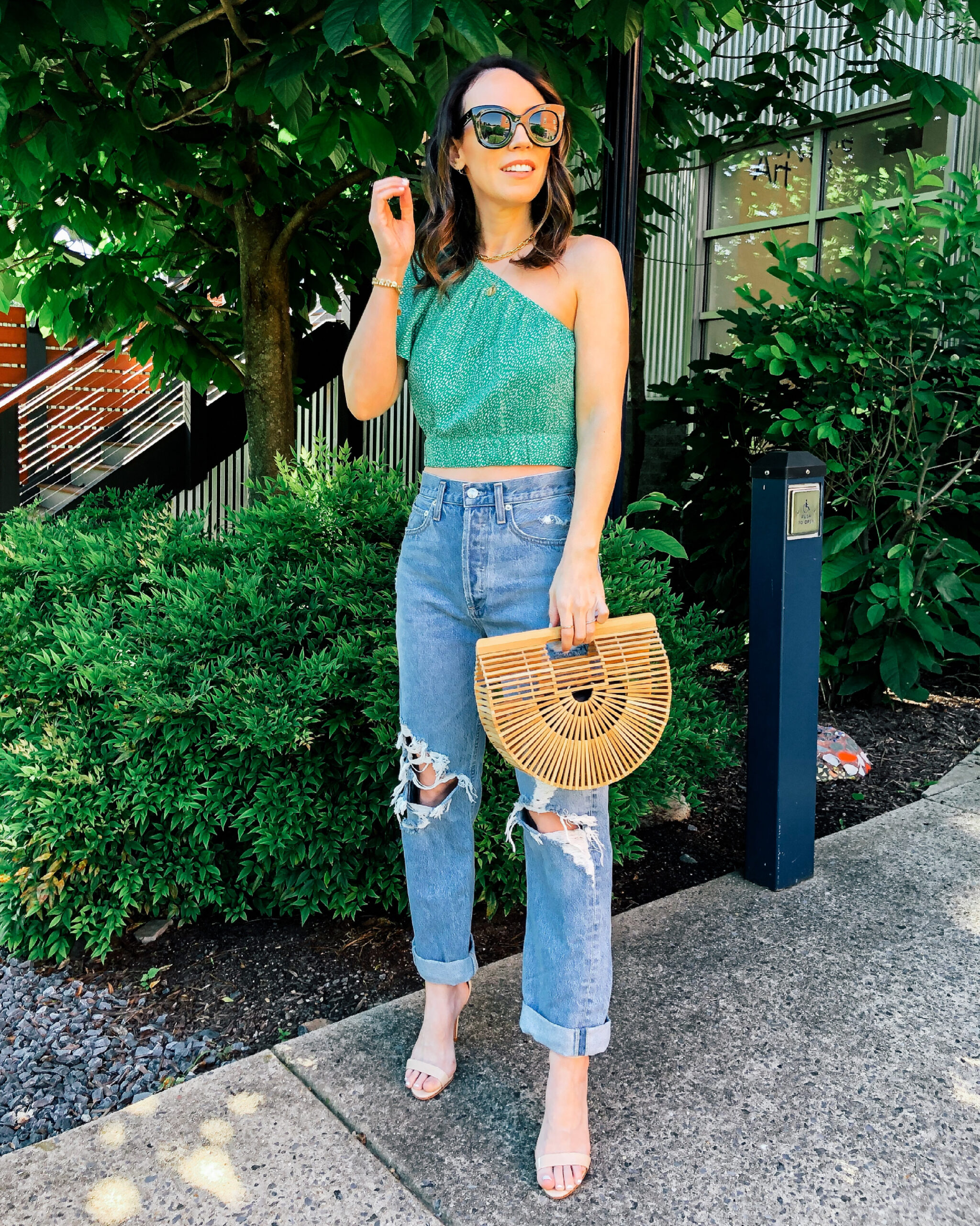 Top – BB Dakota | Jeans – Agolde | Shoes – Schutz | Bag – Cult Gaia | Sunglasses – Amazon | Necklaces – Miranda Frye and Gorjana