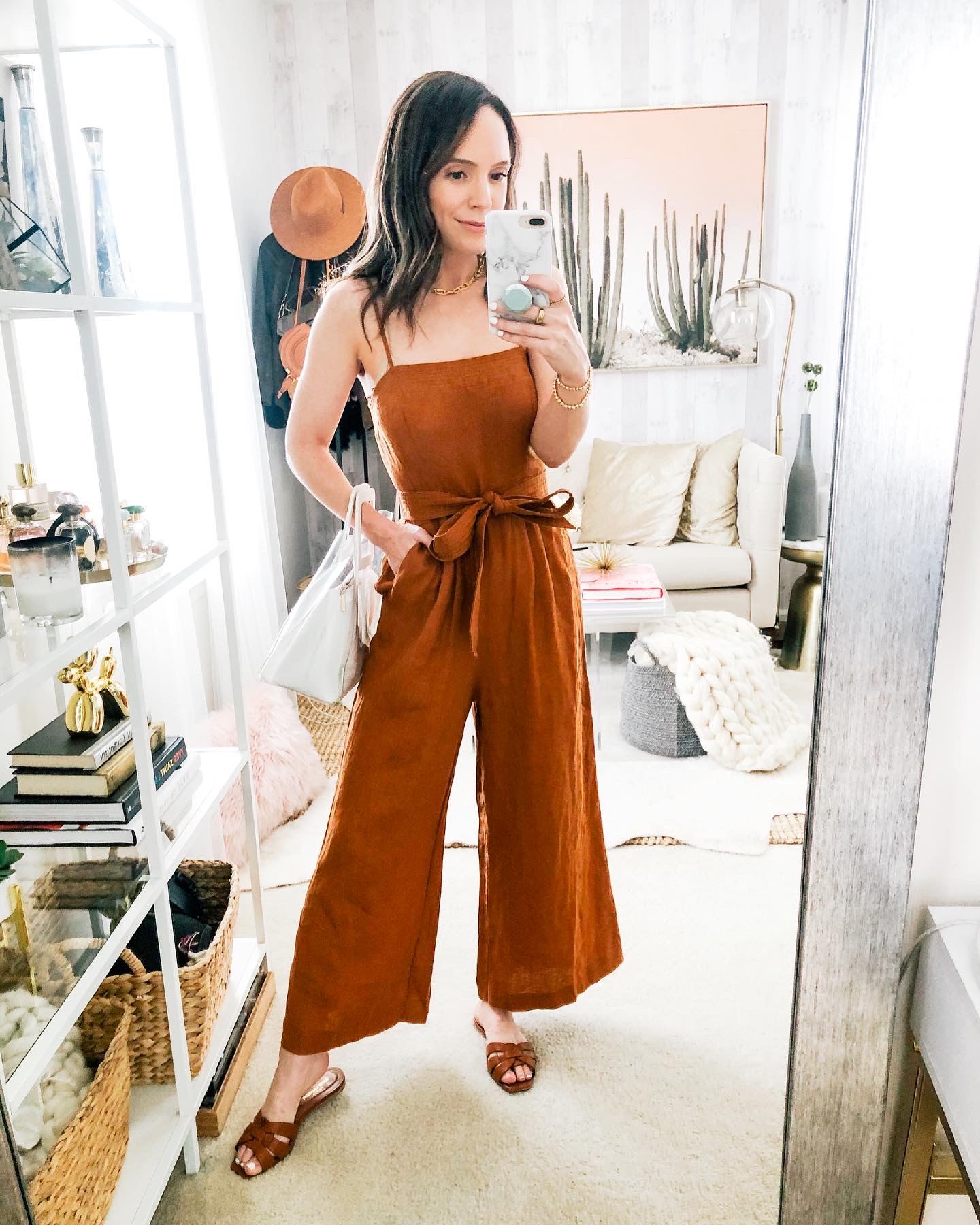 Jumpsuit – J.Crew | Sandals – Saint Laurent | Bag – Staud | Necklaces – Miranda Frye