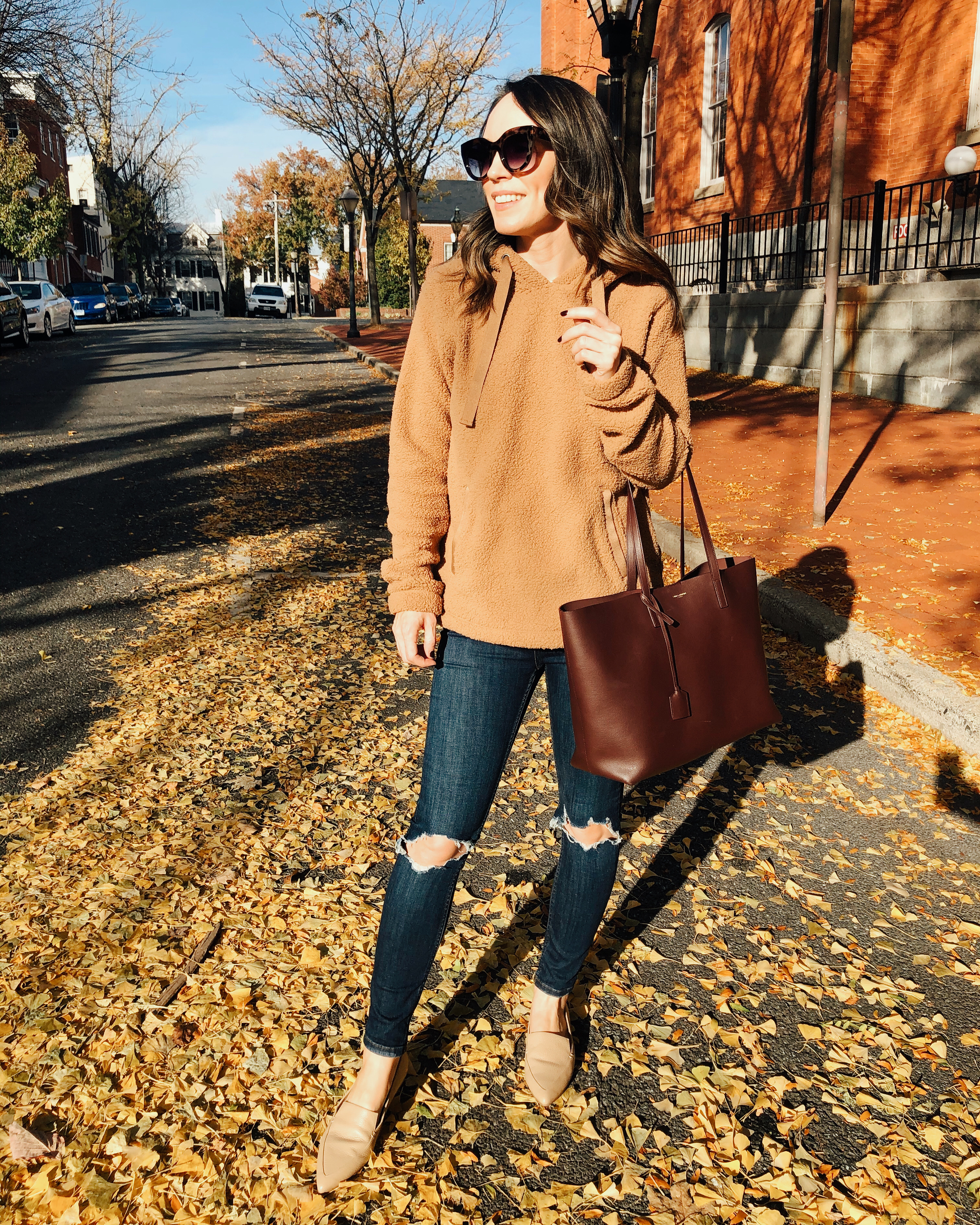 Fleece hoodie | Jeans | Loafers (similar here) | Bag | Sunglasses