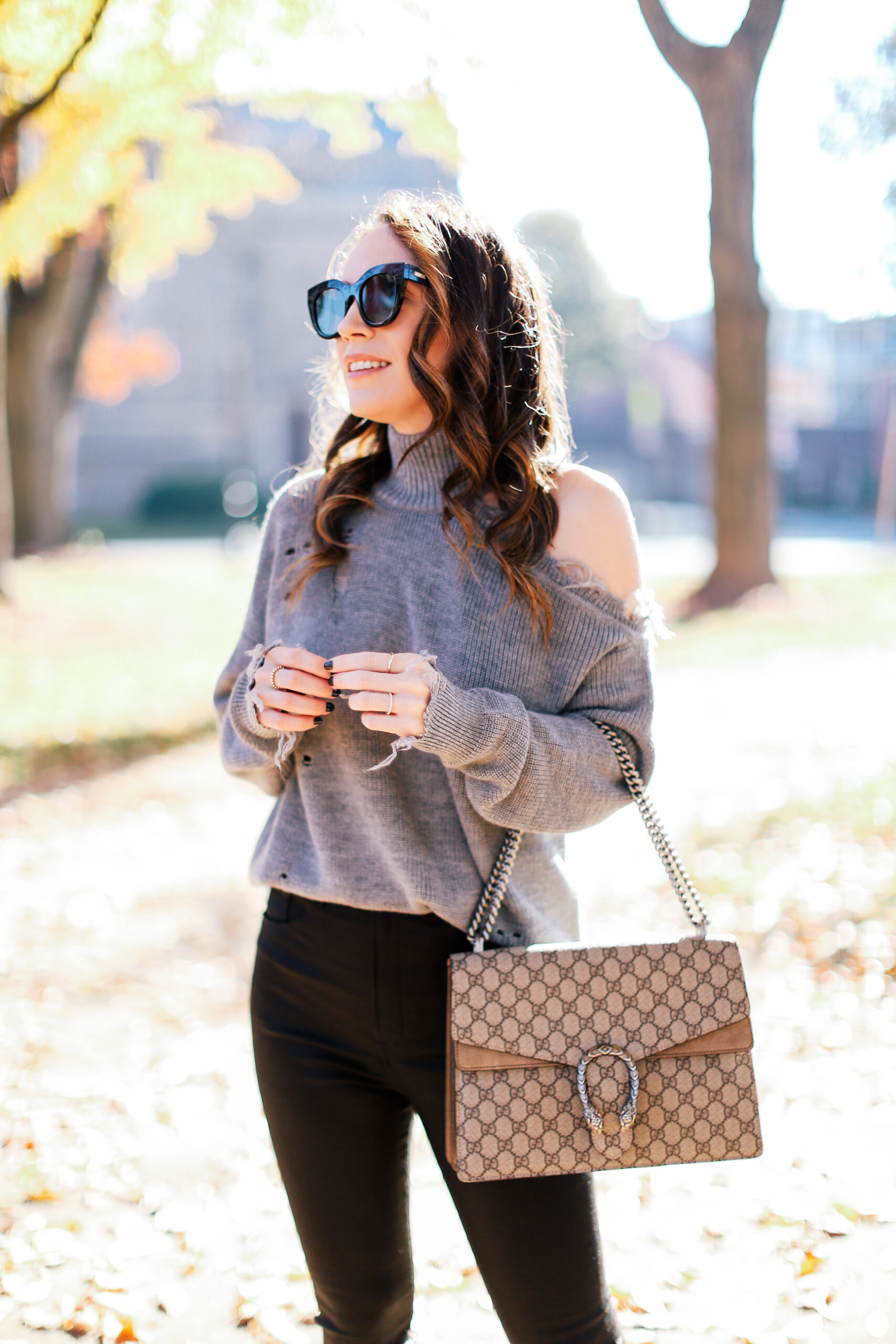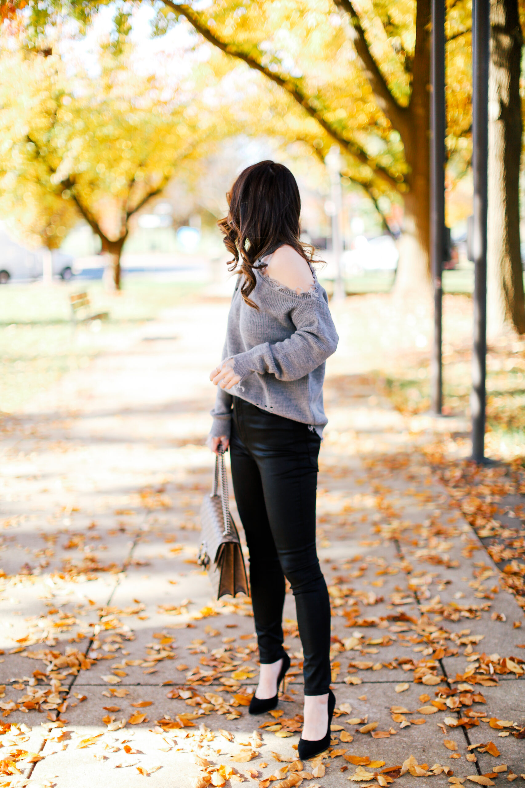 I love the holiday season but I am already missing all the beautiful leaves that are almost gone. Just looking at these photos makes me wish fall was a month or two longer! It’s been so warm here so I have been able to wear a sweater without a coat many days and love it. This sweater is so unique and the cutout shoulder detail is chic and makes it great for dressing up while the distressed details makes it great for wearing with jeans and sneakers. Lovers + Friends has so many great styles so I also pulled together some of my favorites in the widgets below.