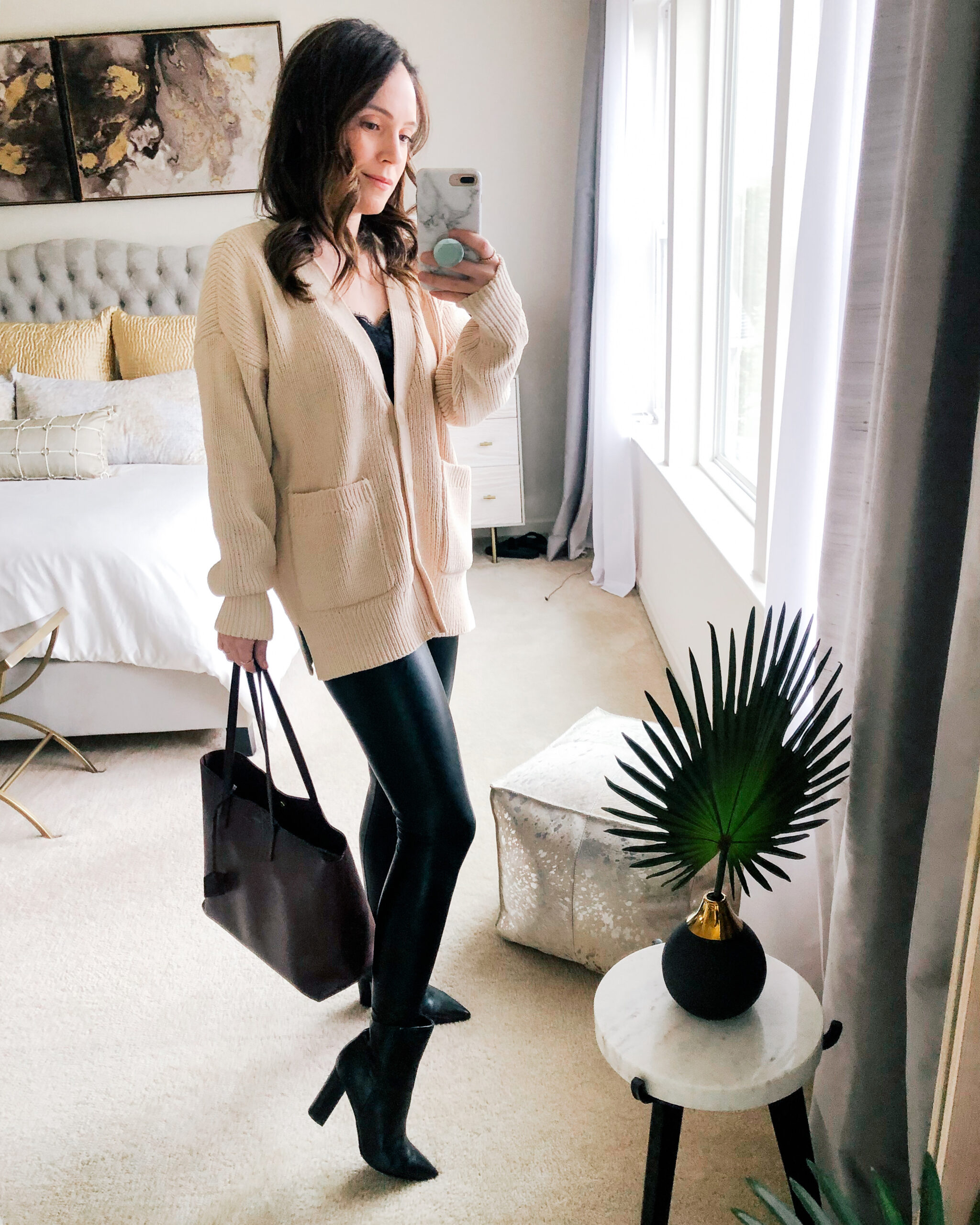 Cardigan – Abercrombie | Camisole – BP (similar) | Leggings – Commando | Boots – Marc Fisher | Bag – Saint Laurent