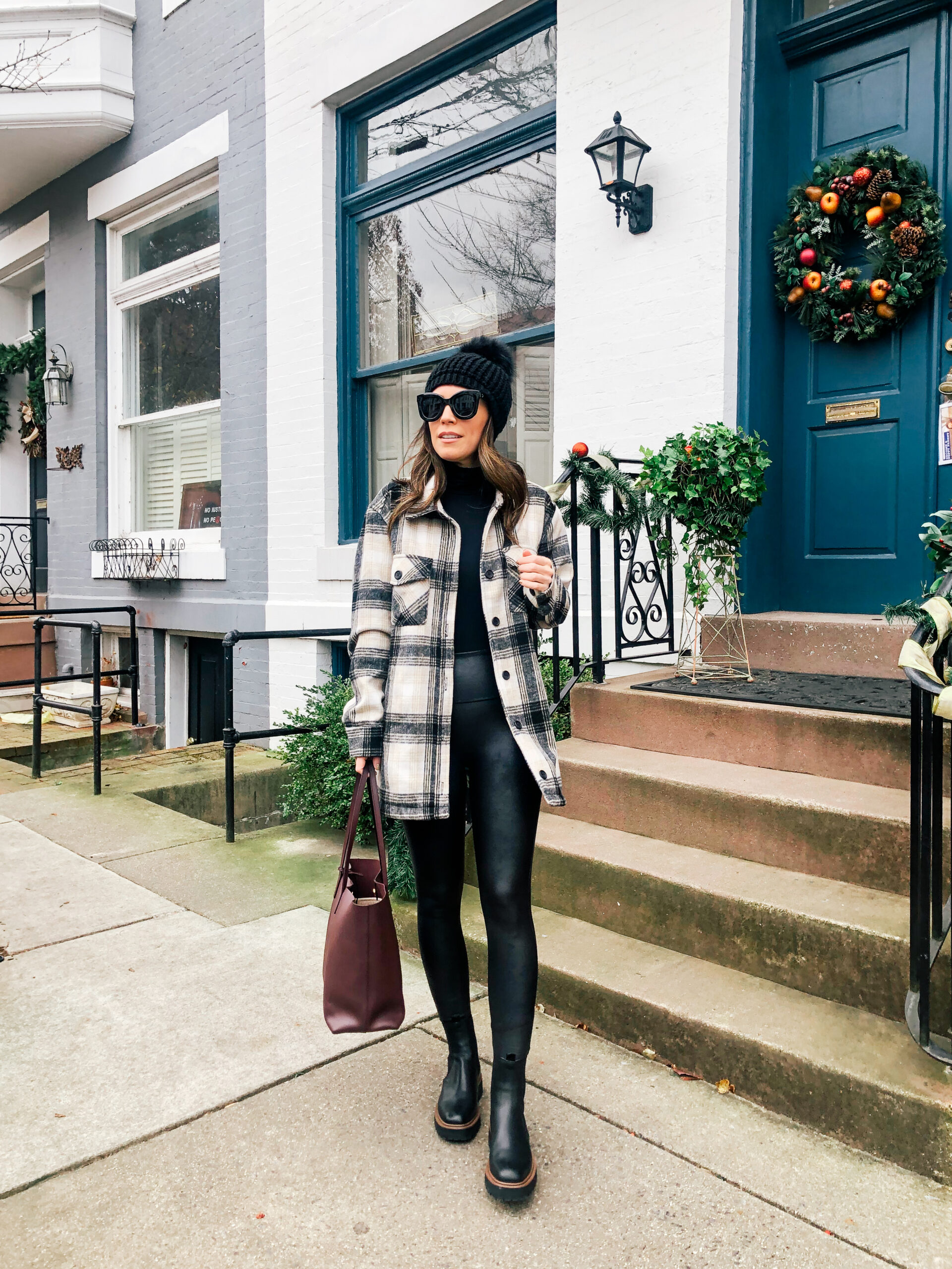 Shacket – Thread & Supply | Turtleneck – Spanx | Leggings – Spanx | Boots – Sam Edelman | Bag – Saint Laurent | Sunglasses – Amazon | Beanie – Kyi Kyi