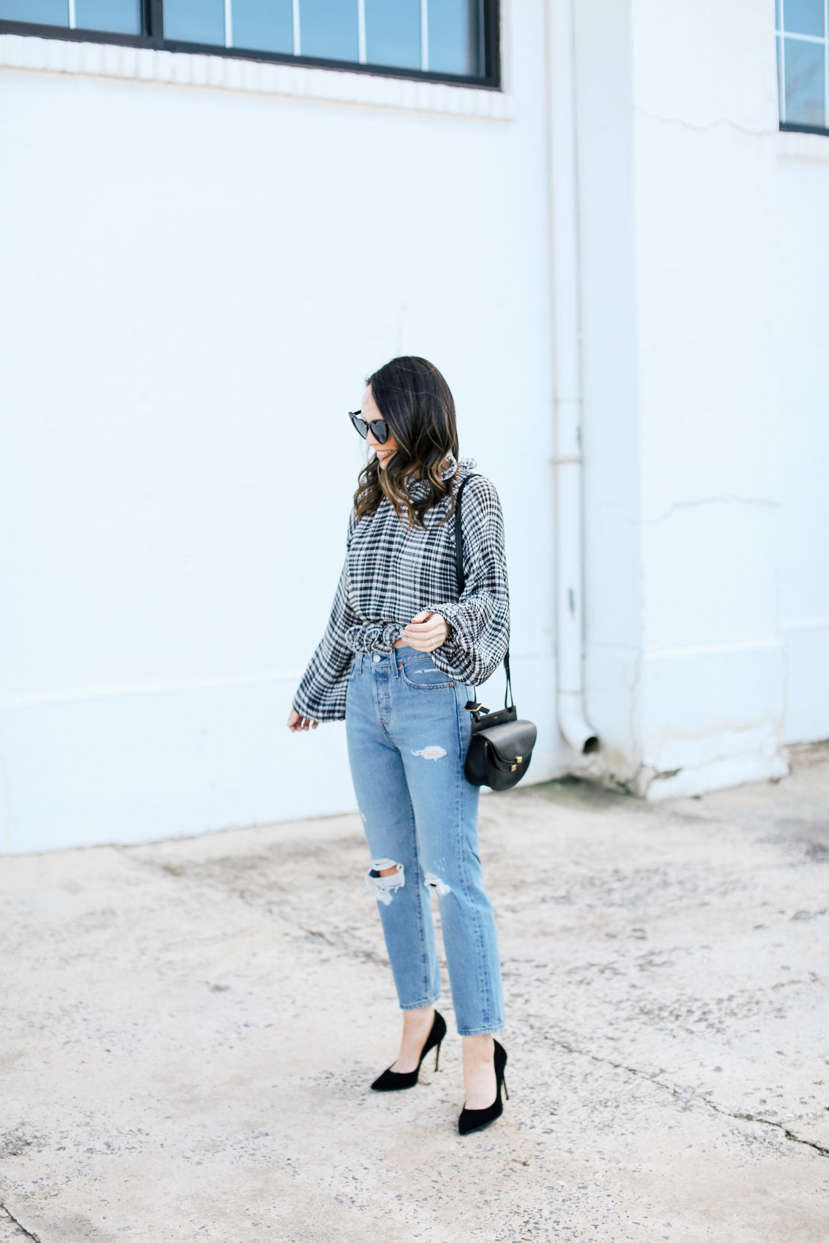 The weather has been really mild recently and it has gotten me in the mood for spring clothes! So I thought I would start to begin to share some spring transition outfits and spring pieces I’m loving. I have always liked to buy things a few months early because once the next season hits, all the good stuff is often sold out. I shared these Levi’s on my insta-stories the other day and they are the same style/fit as these that I wore in this post but in a different wash. I am normally a skinny jean or wide leg gal, but I have been loving this particular high-waisted straight leg style from Levi’s. And wearing it with a more feminine top is one of my favorite ways to style distressed denim. I also pulled together a bunch of other Levi’s styles that caught my eye and put them in the widget below if you are looking for a new pair!